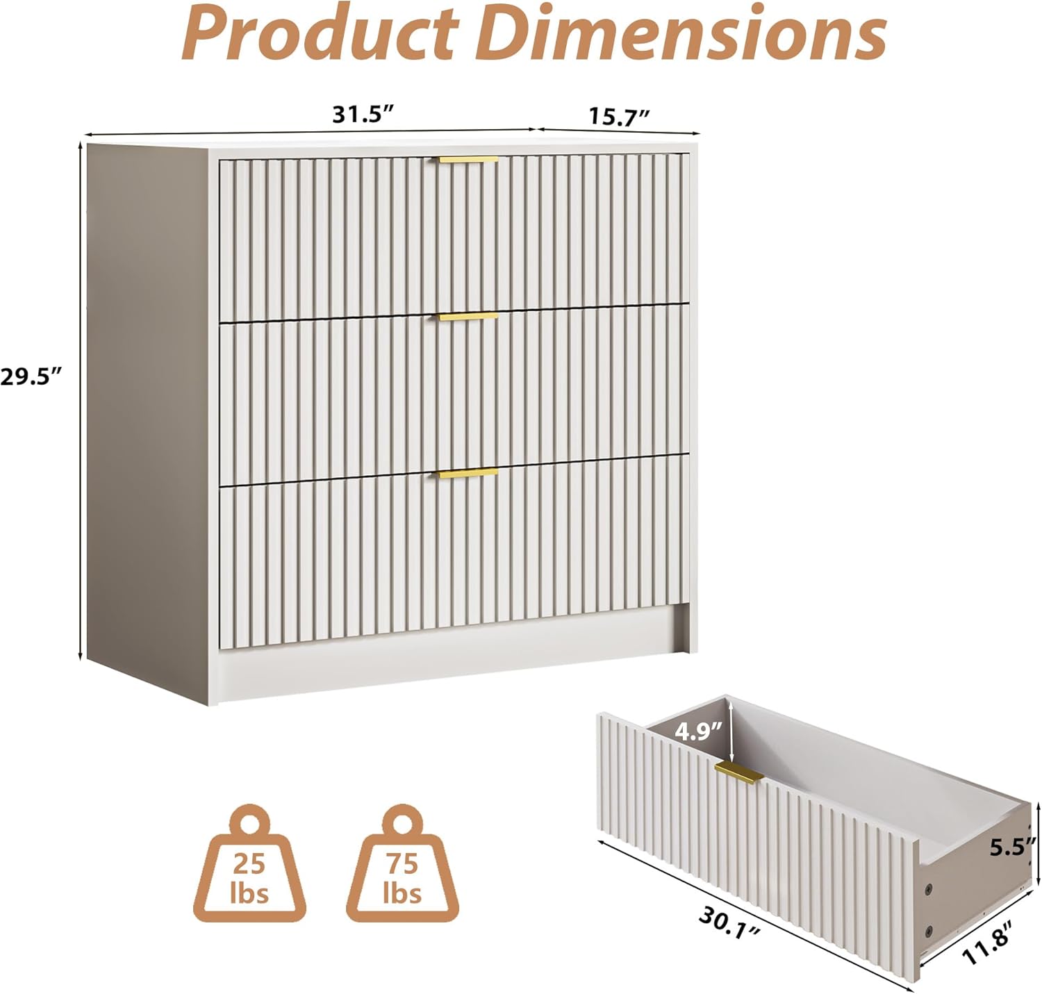 White Fluted Dresser for Bedroom, 32 Inch Wide Nightstand with Large Drawer, 3 Drawer End Table for Bedroom, Living Rooms, Offices, and Entryways