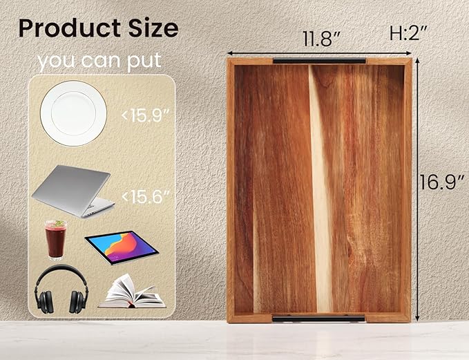 - 【Premium Material, beautiful and durable】 Crafted from carefully selected natural acacia wood, this piece retains the delicate tactile feel of the original wood grain. The surface is hand-polished and treated with eco-friendly lacquer, achieving a smooth and lustrous finish that is moisture-resistant and durable. The natural subtle fragrance and understated hues of the Acacia Woodimbue the tray with a rustic charm, allowing it to harmoniously integrate into any space while fostering a serene and soothing ambiance.