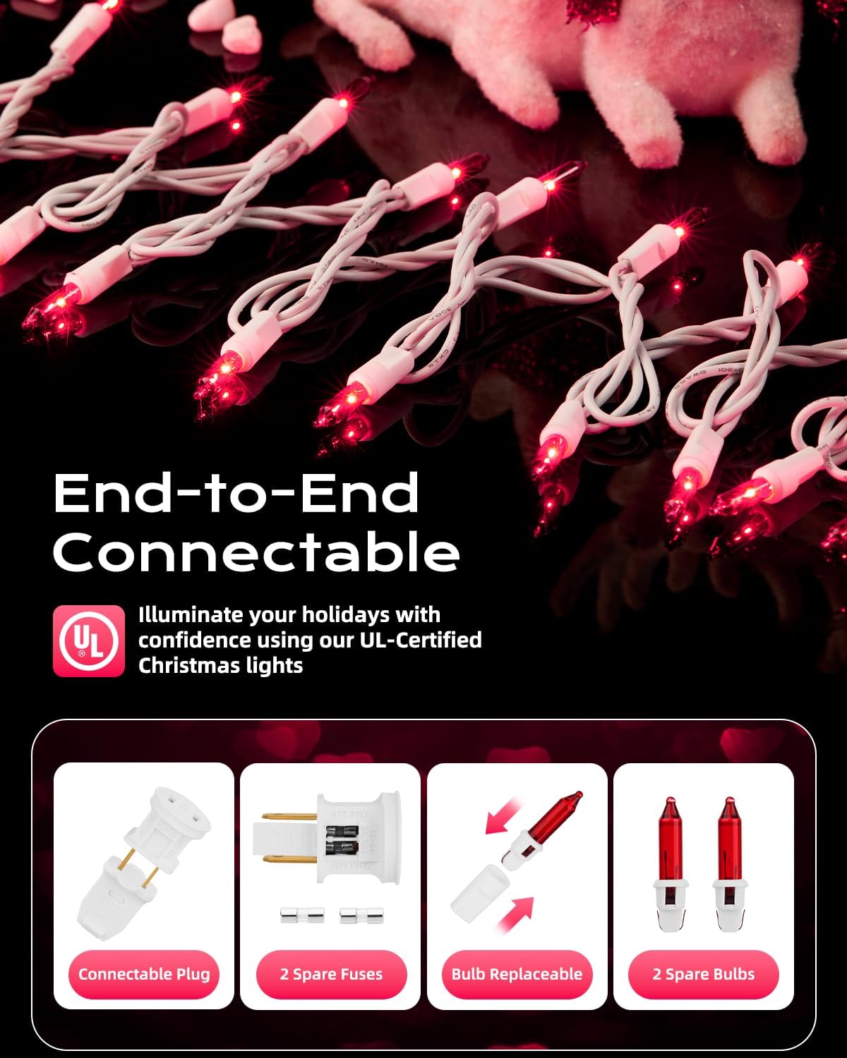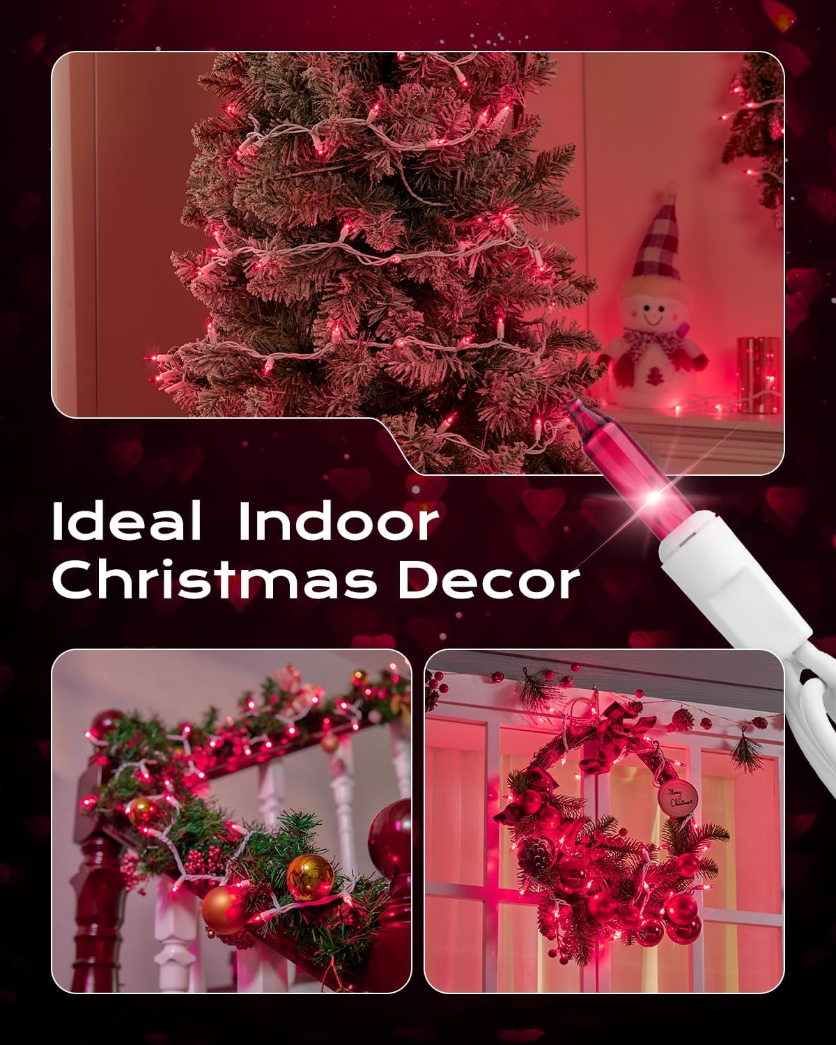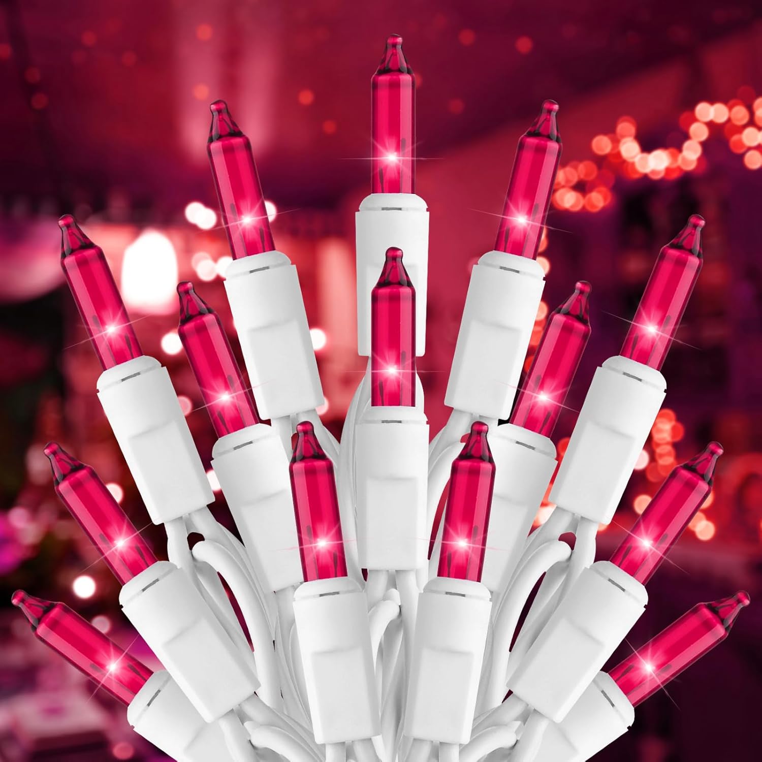 - 【Festive Mini Christmas Lights Set】This set includes 100 pink incandescent mini-lights on 26.5 ft white wire, with bulbs spaced 3-inche apart and 18-inch lead wire. Perfect for holiday decorating, with the ability to connect up to 5 light strings end-to-end;