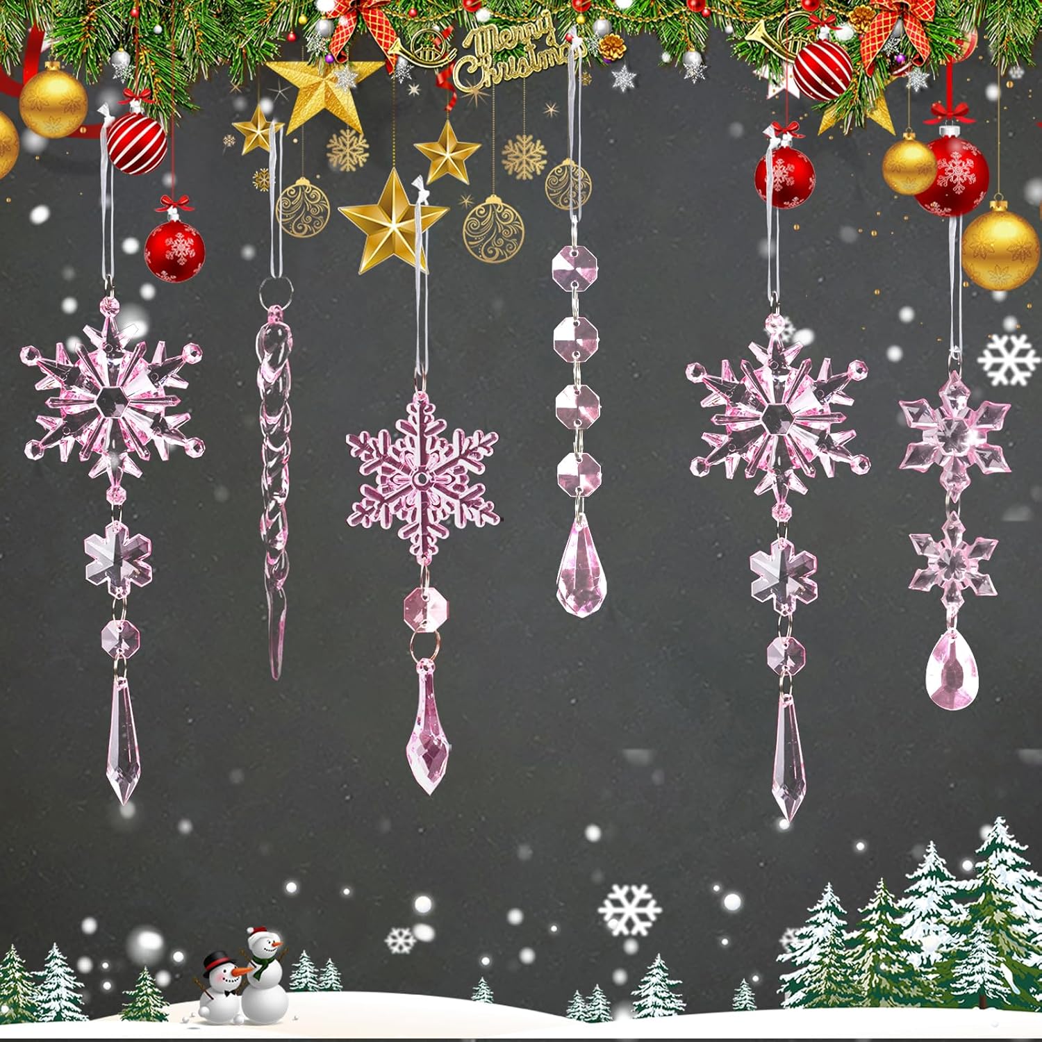 - Package: You will receive a great value pack of 32 pieces pink acrylic Christmas ornaments set in 5 styles, including 12pcs unique designed snowflakes hanging ornaments (5.2", 5.3" and 7.64"), 10pcs 5.3" crystal icicles ornaments and 10pcs 5" bead garlands