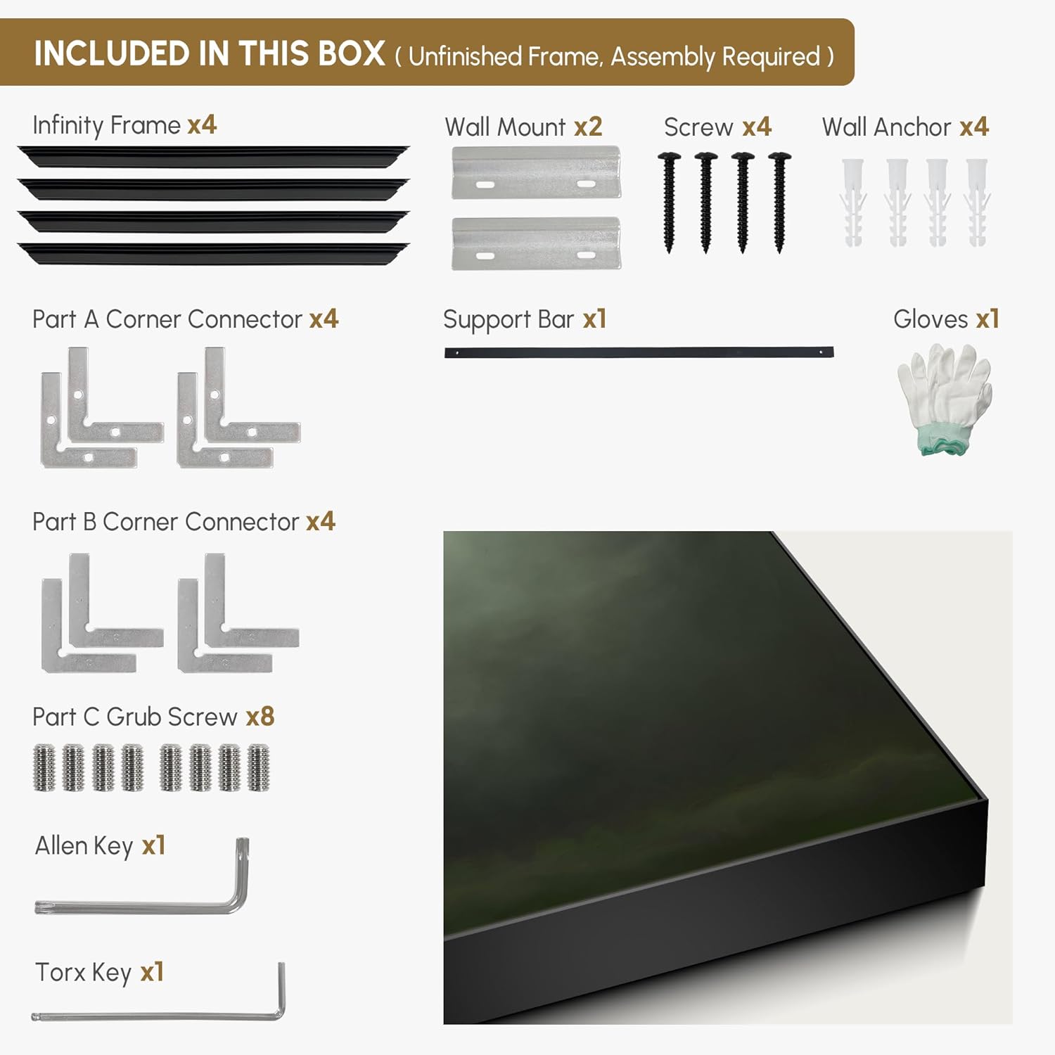- Assembly Required: The artwork comes with the frame components unassembled. Don’t worry — setup is straightforward and tool-friendly. For best results and accurate alignment, we recommend two people to ensure a smooth assembly and a stable, secure wall mount.