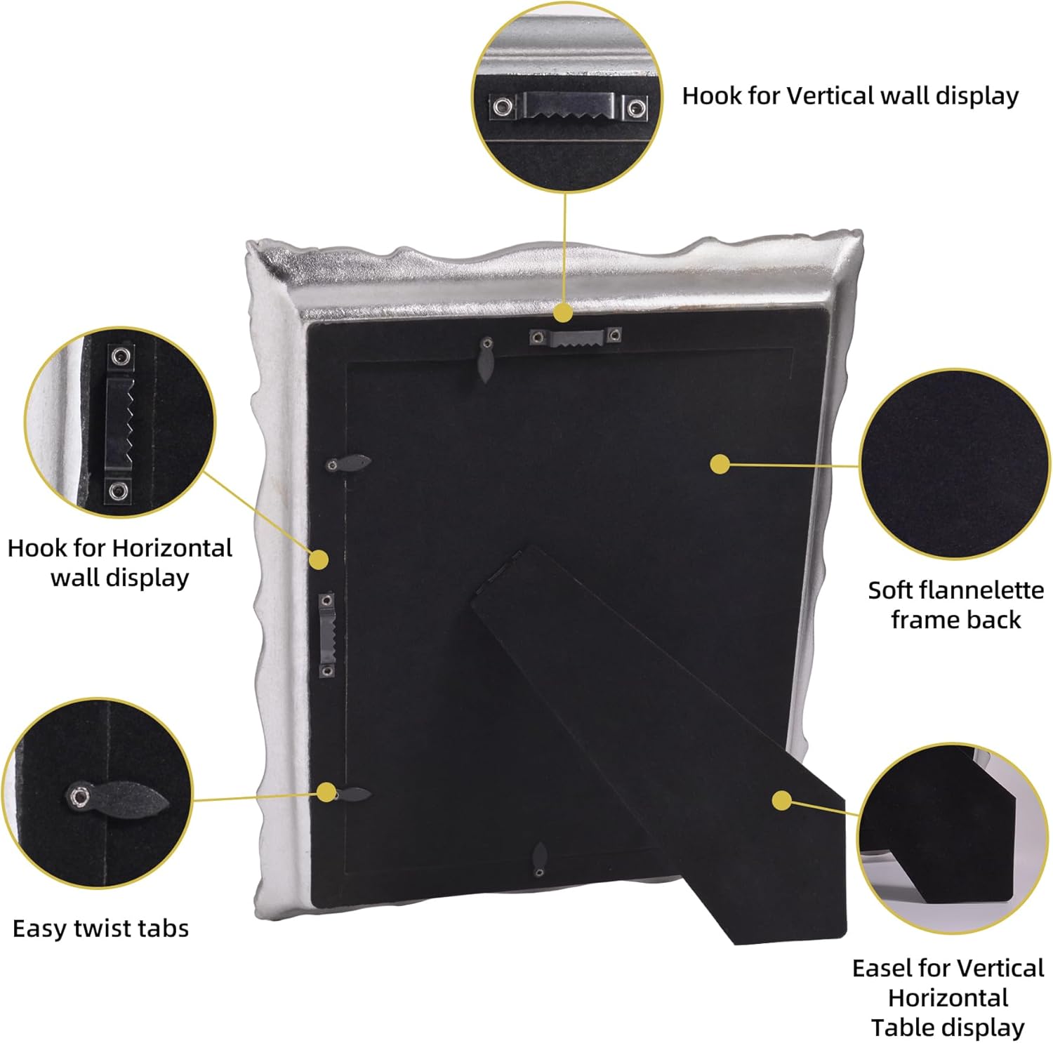 - Easy to Display: This 8x10 silver ornate frame comes with a removable white mat and a decor picture. The white mat can be entirely removed for 8x10 paintings or keep it for 5x7 paintings, perfect to display any photos or paintings. The back of frame is a soft velvet back plate equipped with a easel and two-way serrated hook, which can be displayed on tabletop or hang on the wall in vertically or horizontally.