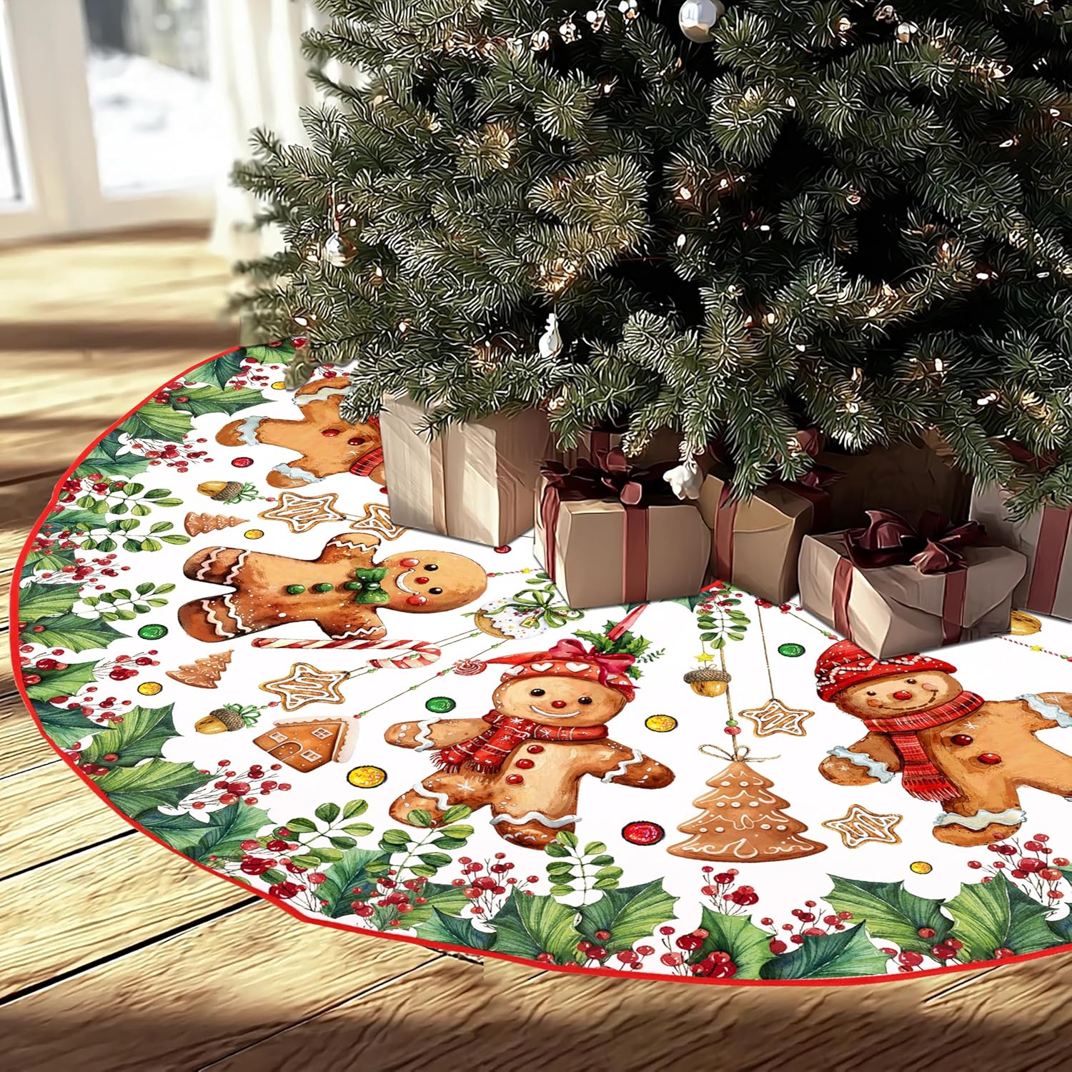 - Premium Fabric and Craftsmanship: Our Cute gingerbread man Christmas tree skirt is made of high-quality linen-like material, with a rustic and farmhouse style. The surface is soft and comfortable, and it won't scratch the floor. It also protects the floor from pine needles or sap. The pattern is beautifully printed and will not fade. The material is durable and the craftsmanship is exquisite, ensuring that it can be used for many years.