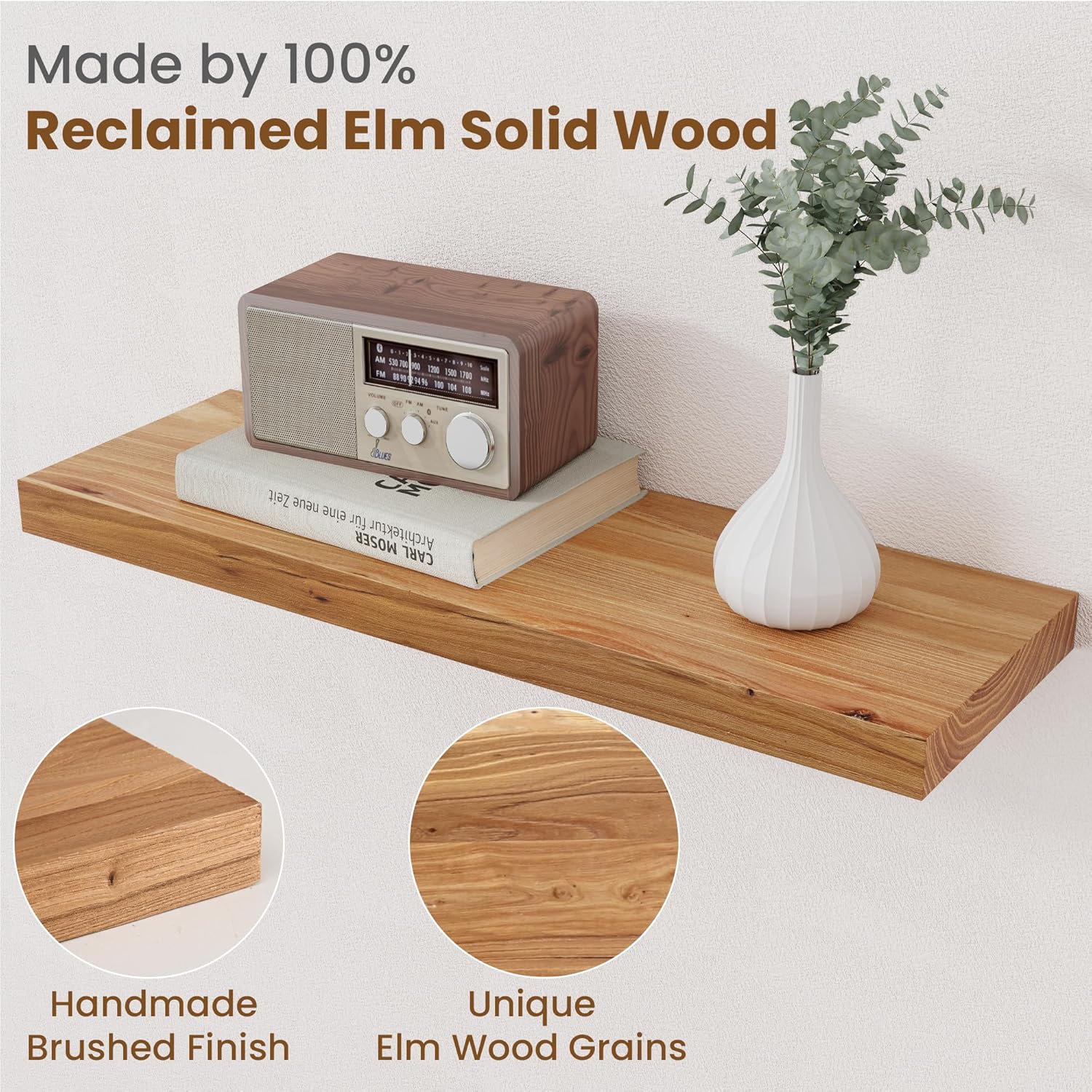 - Solid Elm Wood: Our rustic floating shelves are made of reclaimed elm wood, each floating shelf has a unique natural grain, color, holes, and knots. Don't worry about holes and knots, these are elm itself so you can feel the feeling of nature
