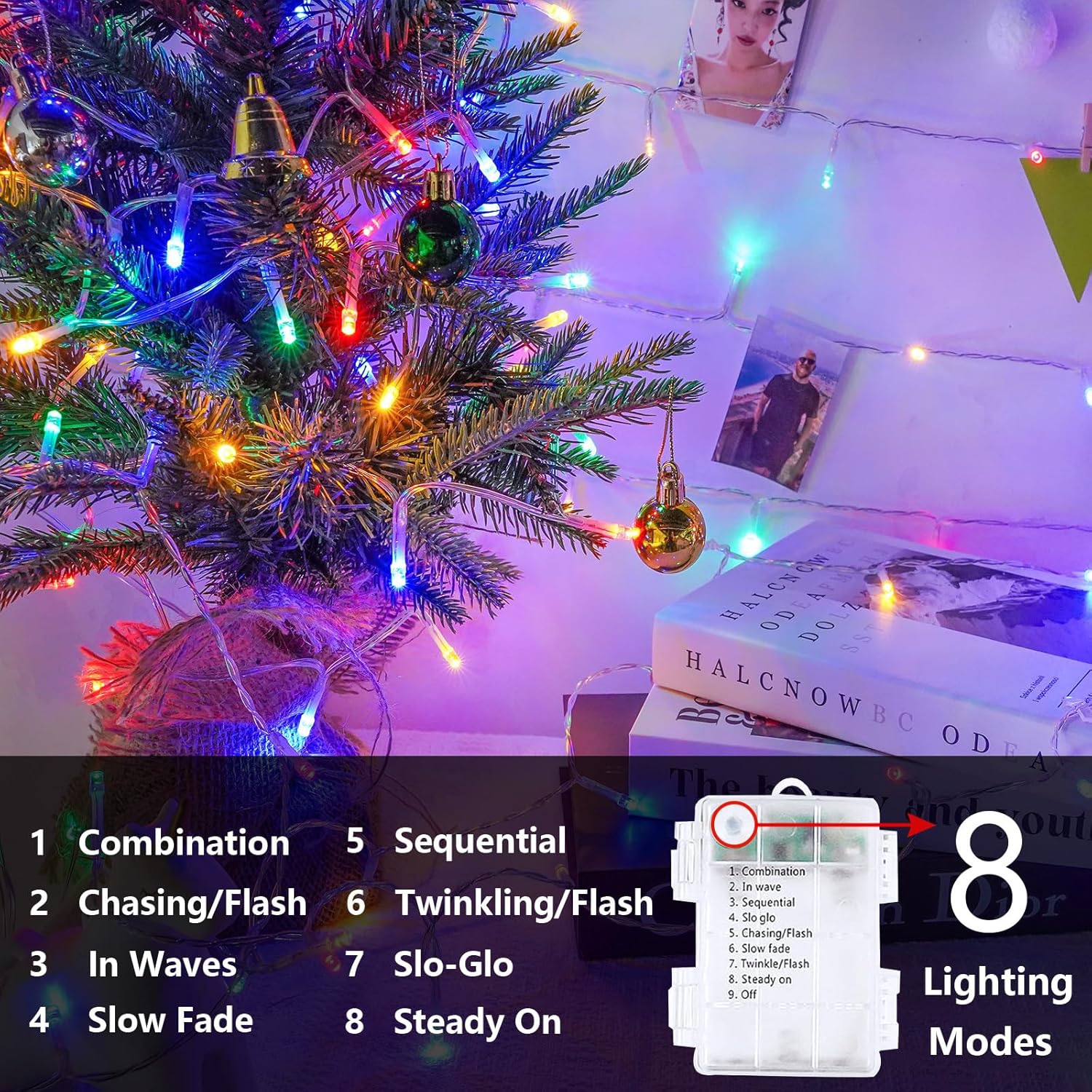 - Ultra-Bright and Durable Battery Powered String Lights: Each string light is 33 feet, features 100 super bright LEDs and a waterproof battery case with 8 lighting modes to ensure longevity and reliability. The multicolor Christmas lights emit a classic, romantic and colorful glow in the dark, making them an ideal choice for indoor and outdoor decorations. These fairy lights are perfect for Christmas, birthdays, parties, weddings, creating a cozy and joyful atmosphere.