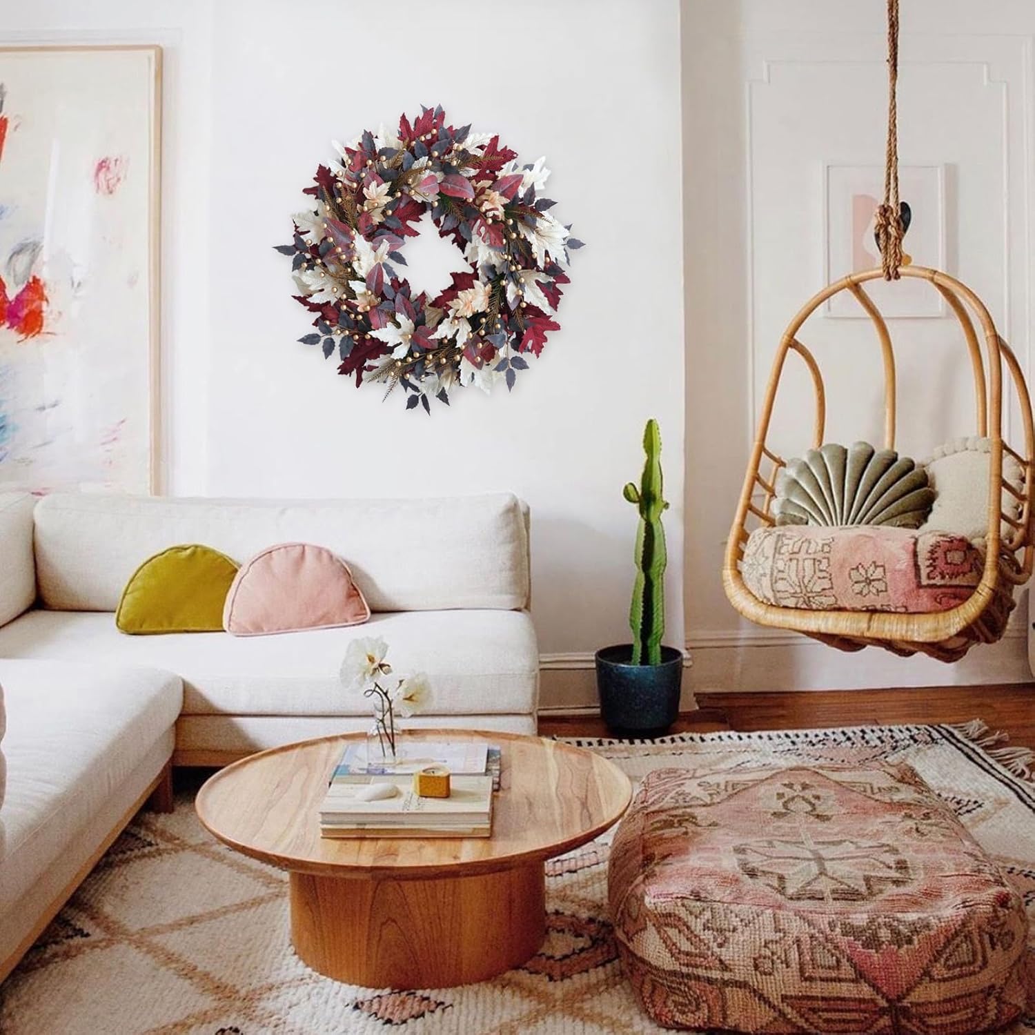- Premium Materials: Carefully crafted with high-quality artificial maple leaves and decorative pearls arranged on a sturdy grapevine base for long-lasting beauty
