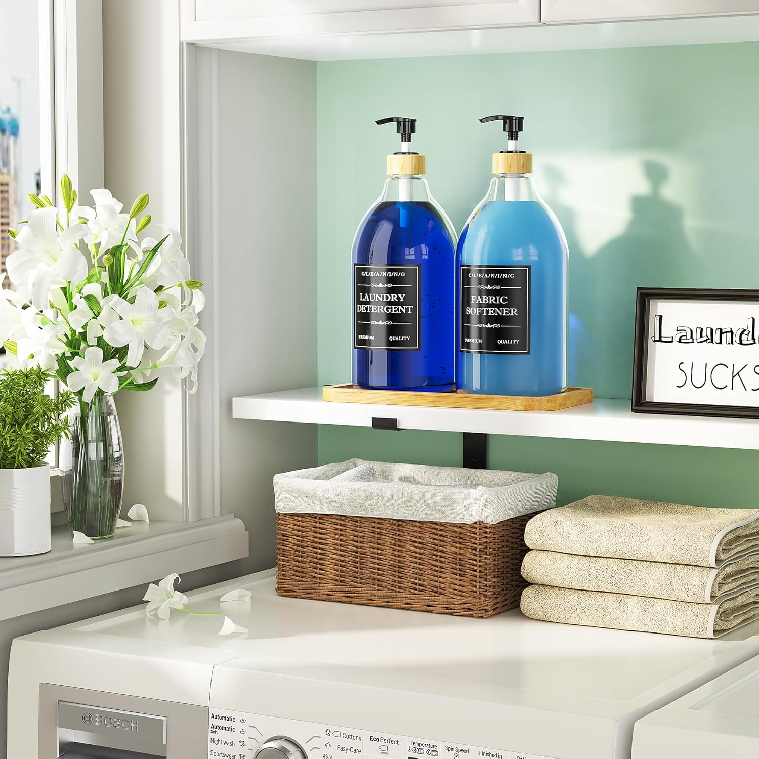 - Laundry Detergent Dispenser Black Set: The set includes 2 64oz plastic laundry dispenser with pump , 1 bamboo tray, 2 bottle caps, 2 measuring cups, 2 silicone funnels and 10 label stickers. It can be used out of the box without the need to purchase other accessories. It is a perfect match for the laundry room.