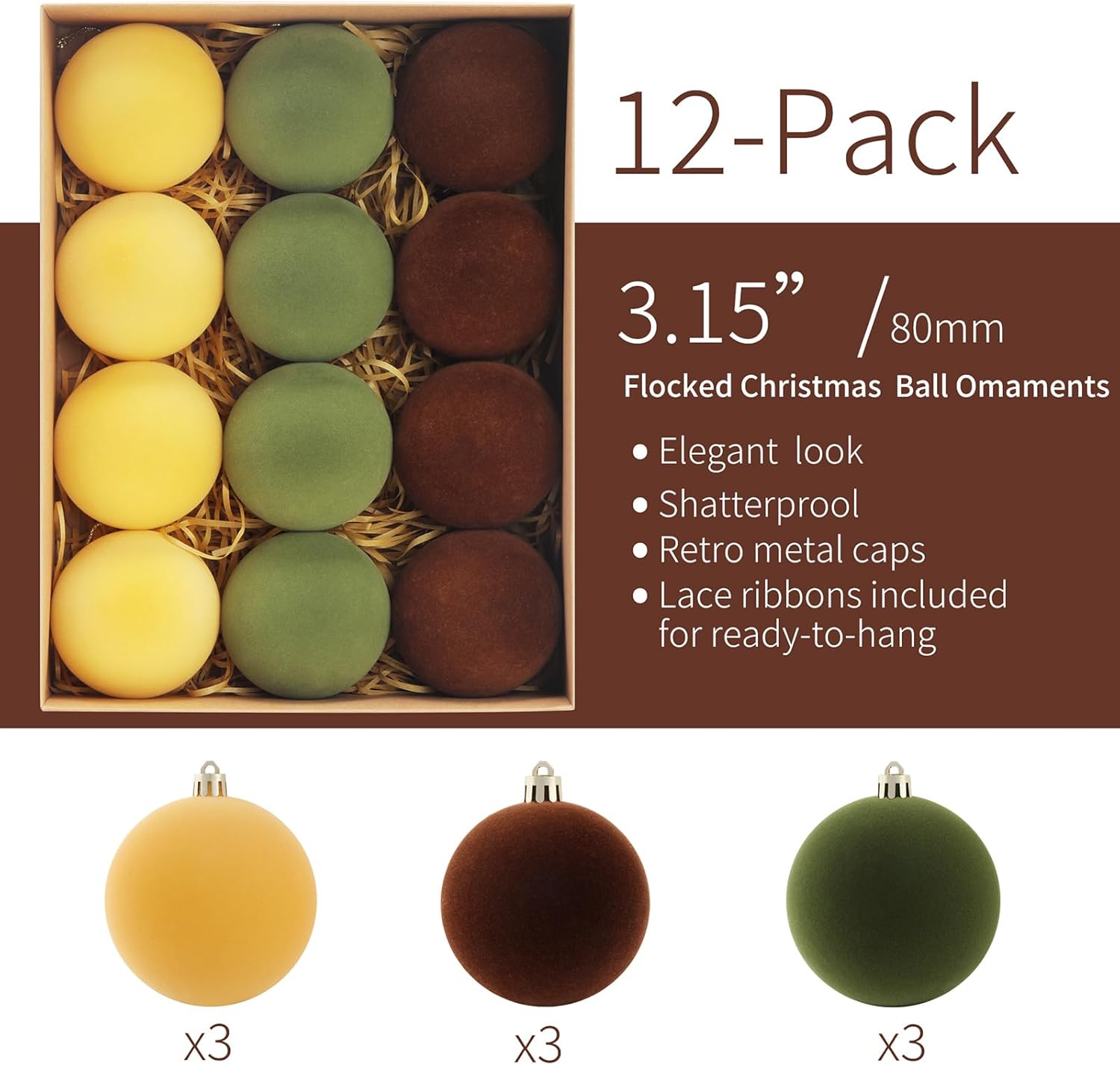 Christmas Ornaments Set of 12, 3.15" Flocked Velvet Balls with Hand Painted Designs, Elegant Christmas Tree Decorations in Gift Box