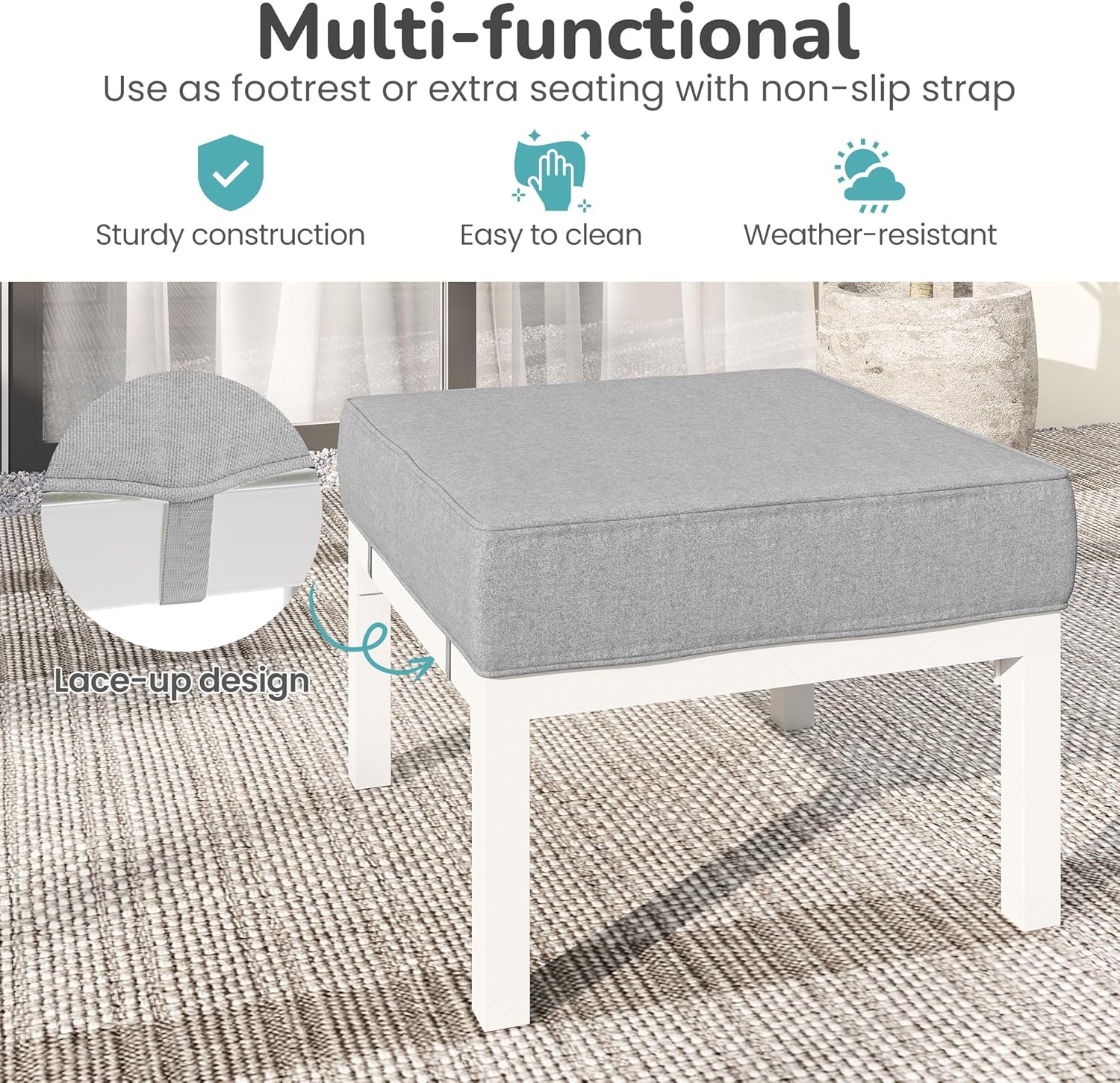 - Weather-Resistant Aluminum Frame: Crafted from lightweight aluminum, our metal patio foot stool resists rust and corrosion, ensuring durability in all weather conditions.