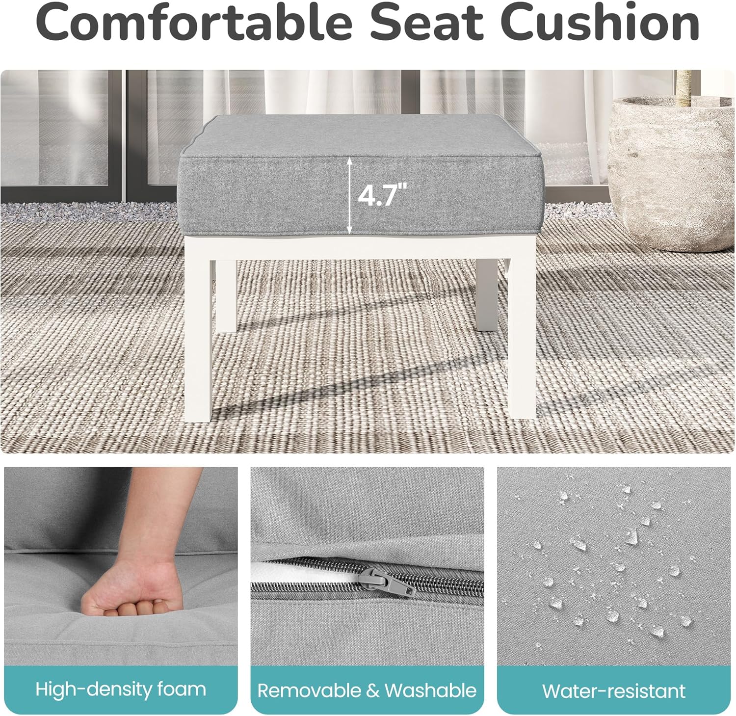 - Easy to Clean: The cushions feature polyester fabric covers resistant to water and UV rays, with a zipper design for easy removal and cleaning. Simply wipe the aluminum frame clean with a damp cloth.