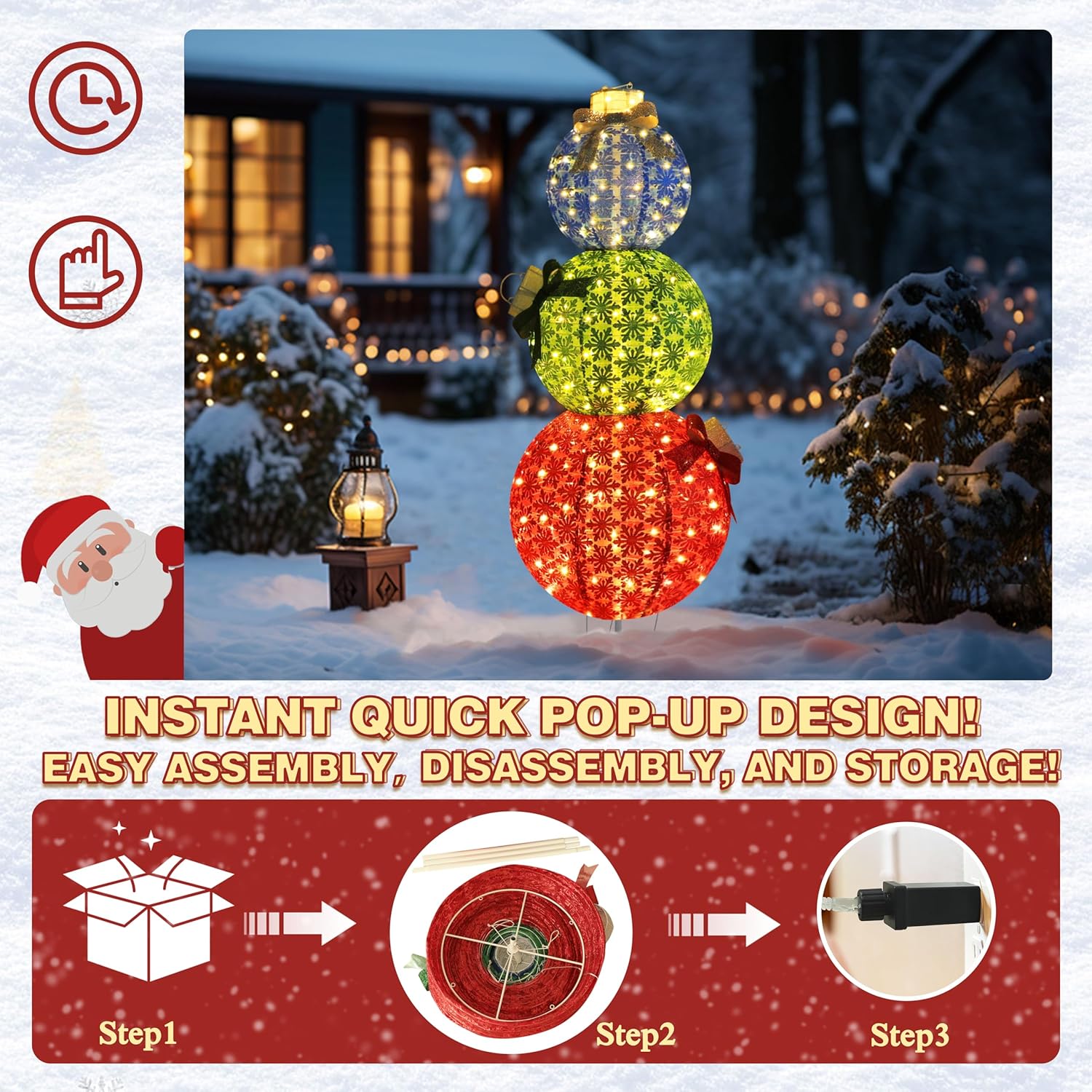 - LED Lights: The lighted pop-up stackable ornaments is installed with dense 210 LED lights beads which make it sparkles warm white in the sun and night. Light up your front yard, make you become the focus of your neighbors