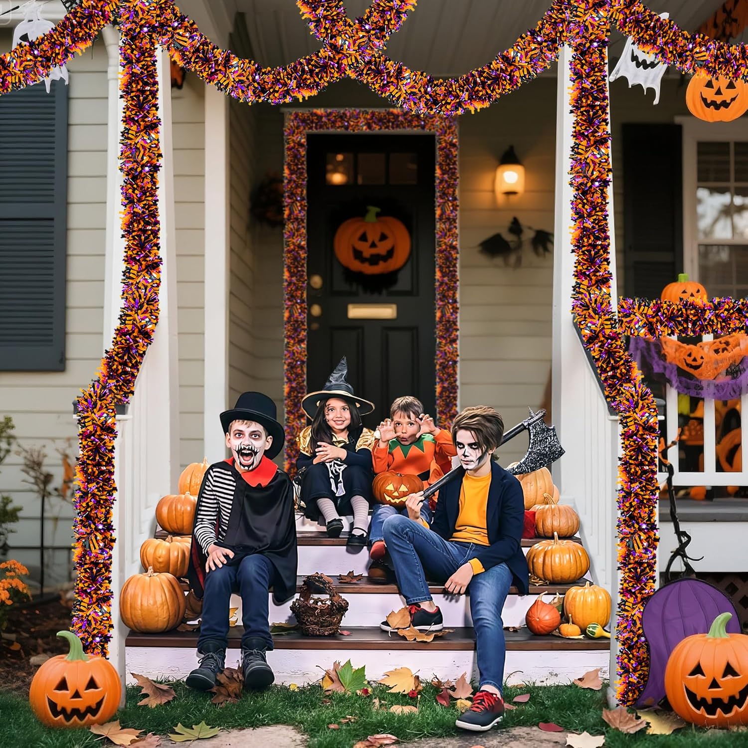 - Wide Applications: Our halloween metallic tinsel garland decorations are suitable for many uses. You can hang the shiny halloween garland on tree, wall, door, window, banister, ceiling, fireplace, stairs, mantel and wherever you want, easily creating impressive decorative effects and adding a festive atmosphere to halloween themed parties, birthday, home indoor outdoor decor, haunted houses, etc