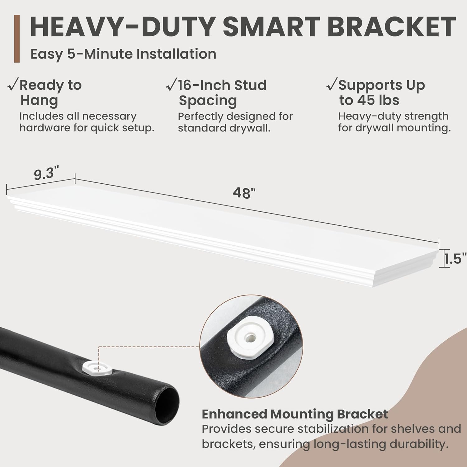 - Package Contents: 1 white floating shelf included, board dimension: 47.3"Wide x 9.3" Deep x 1.5" Height. Other accessories: 1 metal brackets, 1 magnetic level, 3 wood iron connection screws, 9 wall screws and expansion tubes, and 1 installation manual
