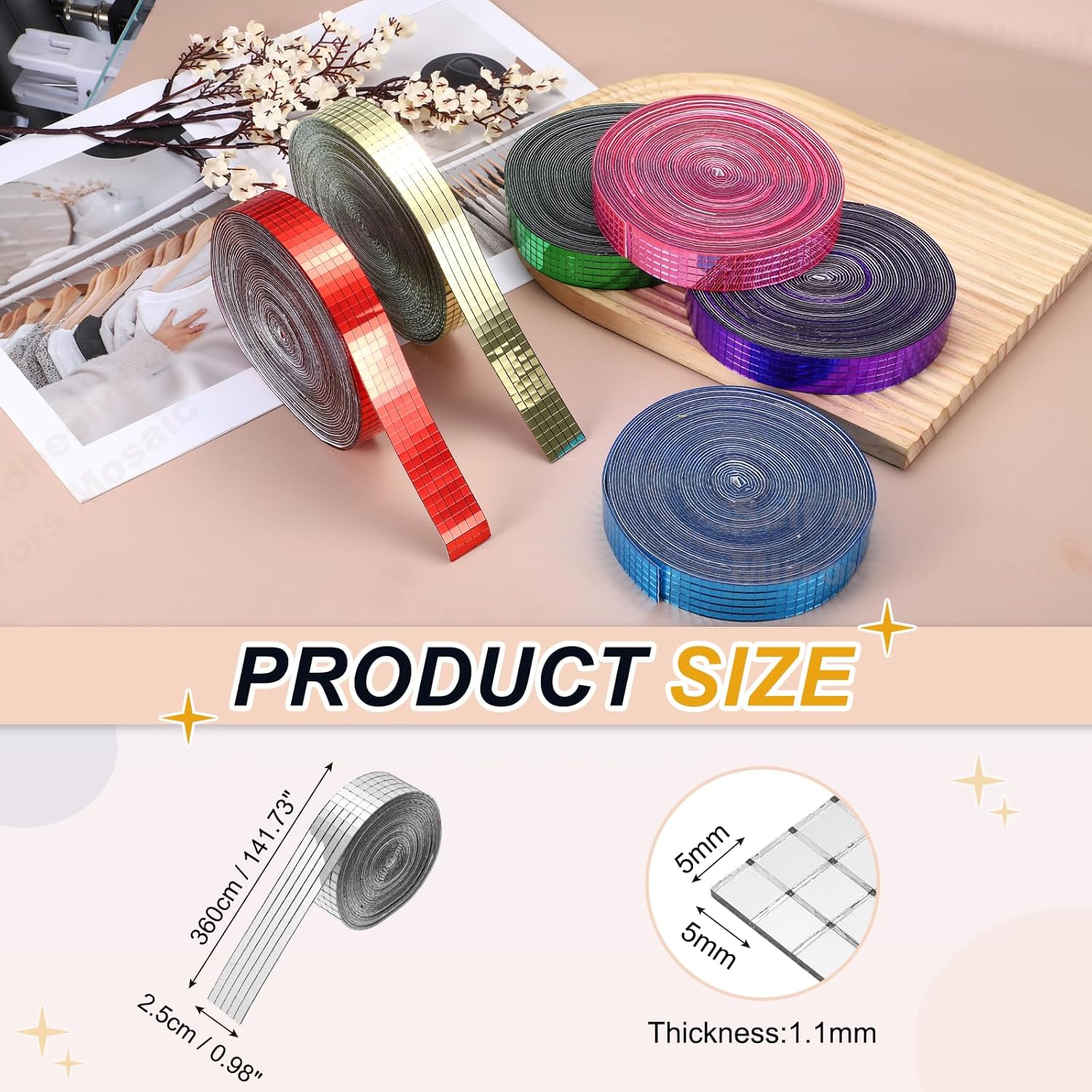 - Specification: Color: Silver Tone; Material: Glass; Size:360x2.5cm/141.73x0.98Inch(LxW); Thickness:1.1mm/0.04inch; Each Tile Size: 5x5mm/0.2x0.2inch; Packing List: 3600 Pcs x Self Adhesive Mirrors Mosaic Tiles (Roll of 1)