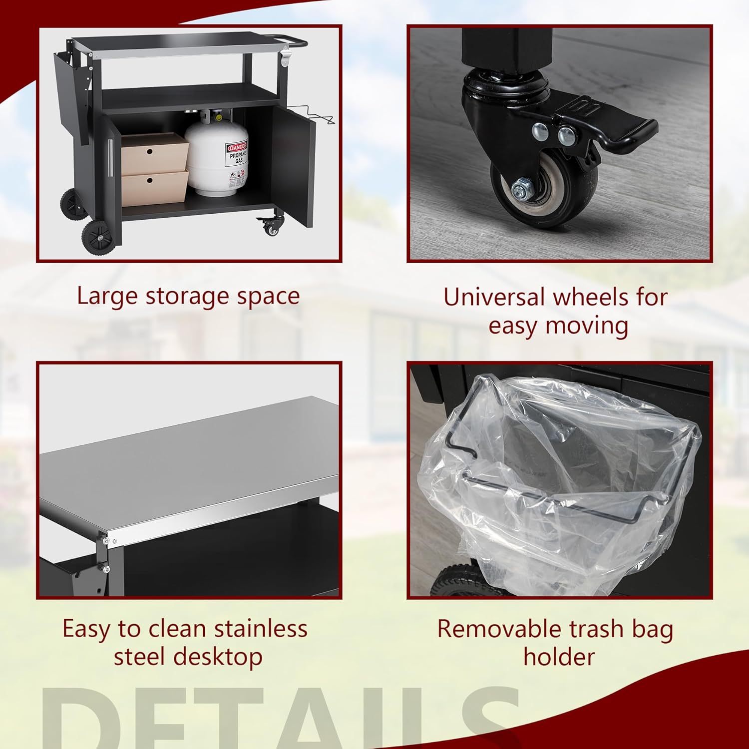 - Large Storage Capacity: Our grill carts include a bottom board with the capacity to hold a gas cylinder. Equipped with 6 convenient S-hooks, towel rack, bottle opener, trash rack, place as many tools as you want on this portable grill cart and become an outdoor prep station.