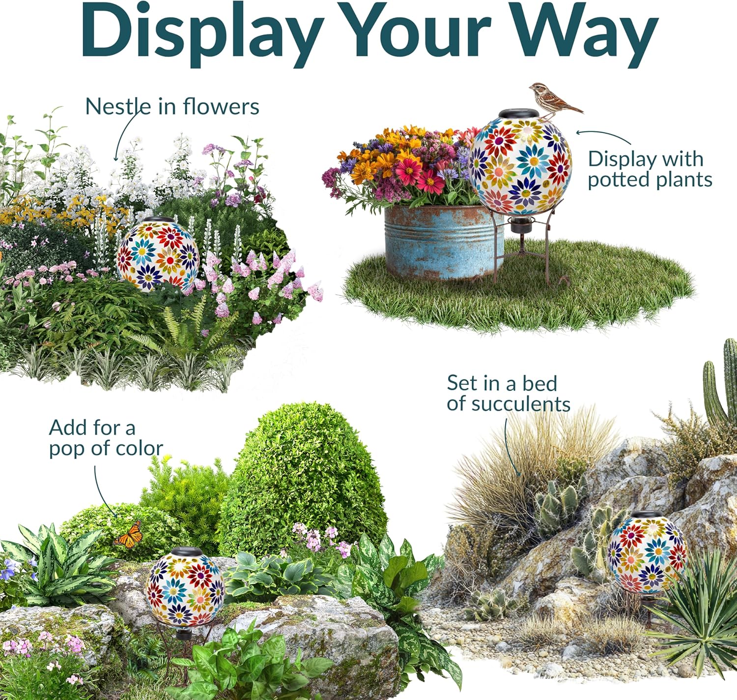 - ADD VIBRANT COLOR TO OUTDOOR SPACES: The gazing globe ball is made from glass with a unique mosaic design. Several beautiful shades will add style to the garden, on the patio, or in flower beds.