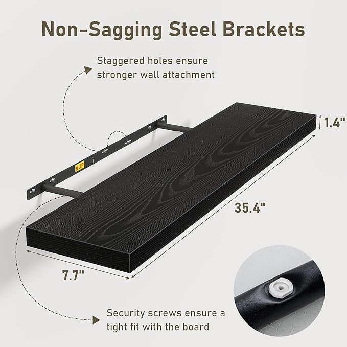 - 36 Inch Floating Shelves for Wall (Set of 2): Each wall shelves are 8 inches in depth and 1.4 inches in thickness. 2-piece set is more cost-effective and practical. Our wall shelf can be used in combination, staggered high or low on the wall, or mounted side-by-side to provide extra storage space for organizing small items and clutter in multiple areas such as kitchens, bathrooms, and bedrooms, creating a clean and smooth look. Multiple colors available