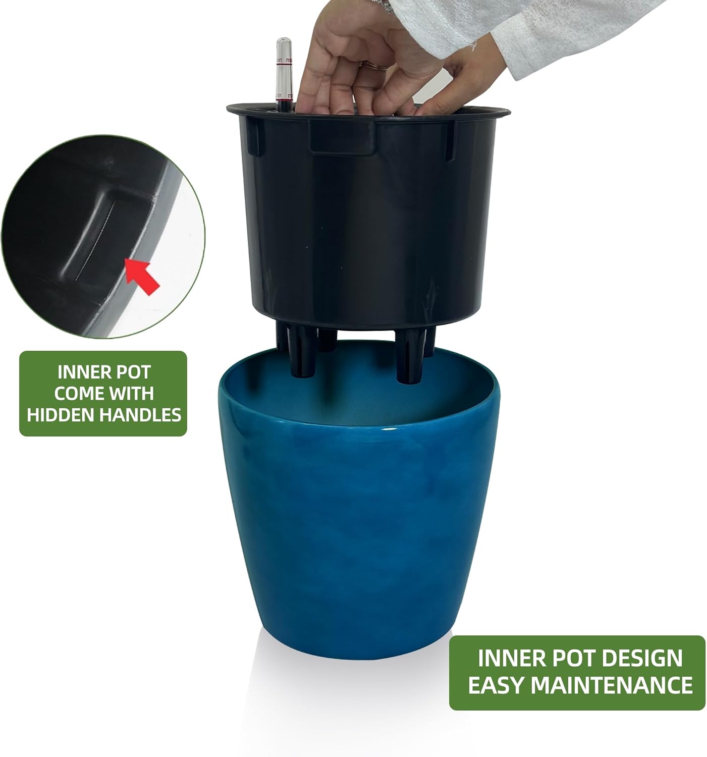 - SELF WATERING & NO MORE ROOT ROT - The smart unique sub-irrigation system is one of the most appealing aspects among all Dexceder planters. The easy-to-use separated integrated water reservoir or catcher- keeps your soil well aerated and automatic supplies plants with the right amount of ongoing moist air & nutrition for optimal growth. The insert indicator shows you the exact time to water again. The full water supply period can single-handedly last over 3 weeks based on different live plants