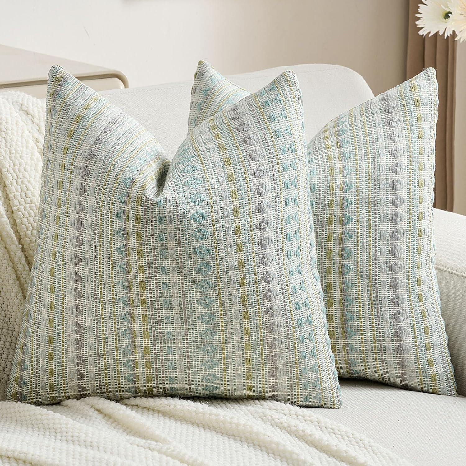 FUTEI Green Blue Decorative Throw Pillow Covers 20x20 Inch Set of 2,Soft Cozy Chenille Jacquard Textured Cushion Case,Boho Home Decor for Couch Bed Living Room