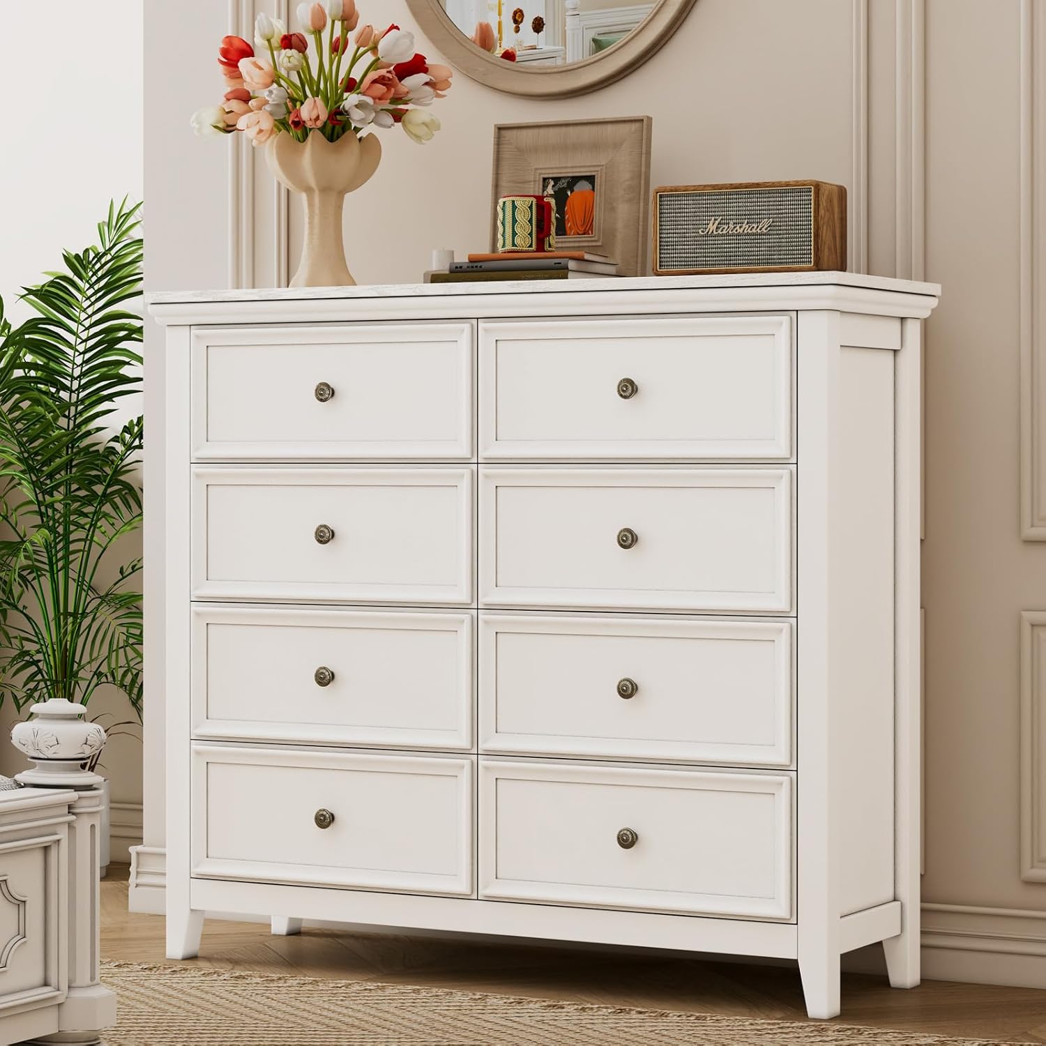 - 【Simple Design】This dresser has 8 drawers which provides large capacity and ample storage space. Its sleek white finish and new-age design compliments existing decor