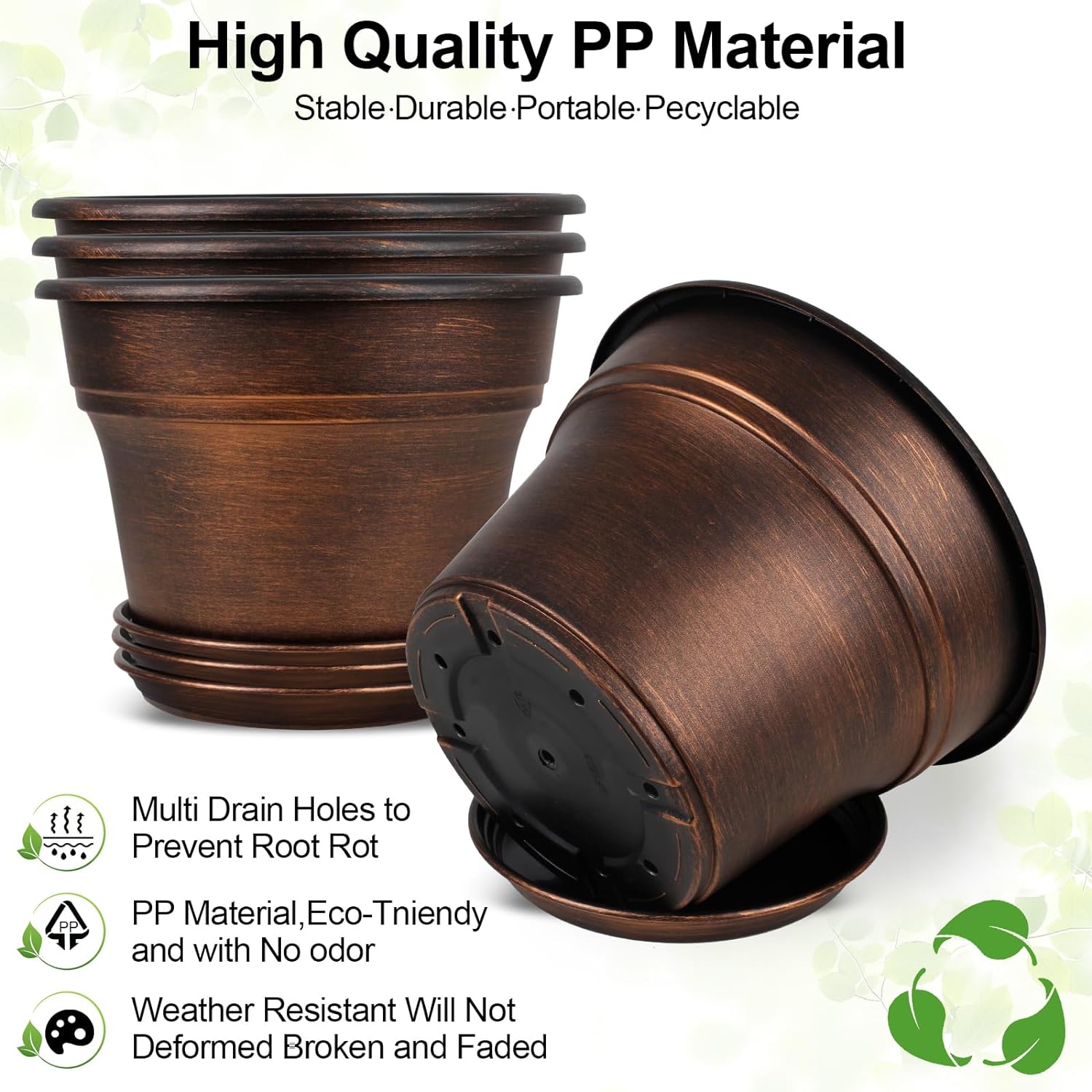 - 【TRADITIONAL DESIGN】Plastic planters for indoor plants with trays are designed in dark gold colors & a classic round look, which allow this pot to fit into any indoor & outdoor setting. With these golded flower pots, it could adds fresh, decorative flair to your home. Decorate your windowsill, desktop, shelf, bedroom, living room, kitchen, garden, office with our 8 inch plastic plant pot.