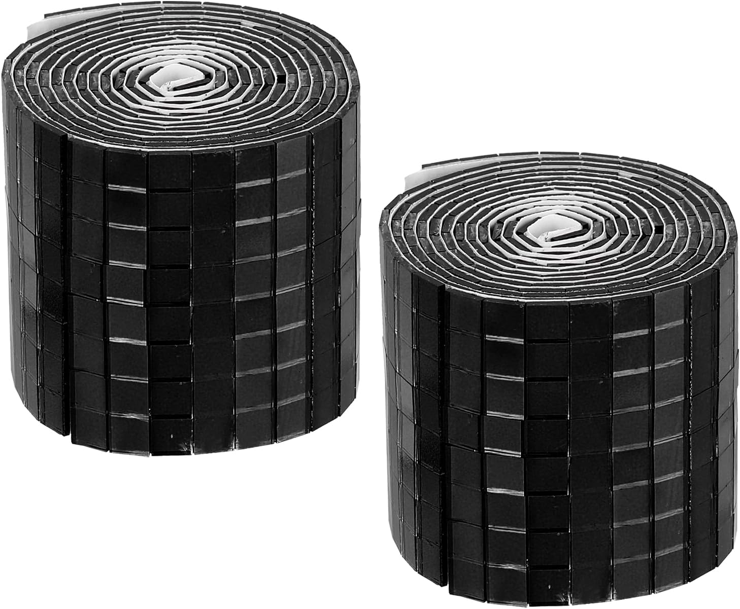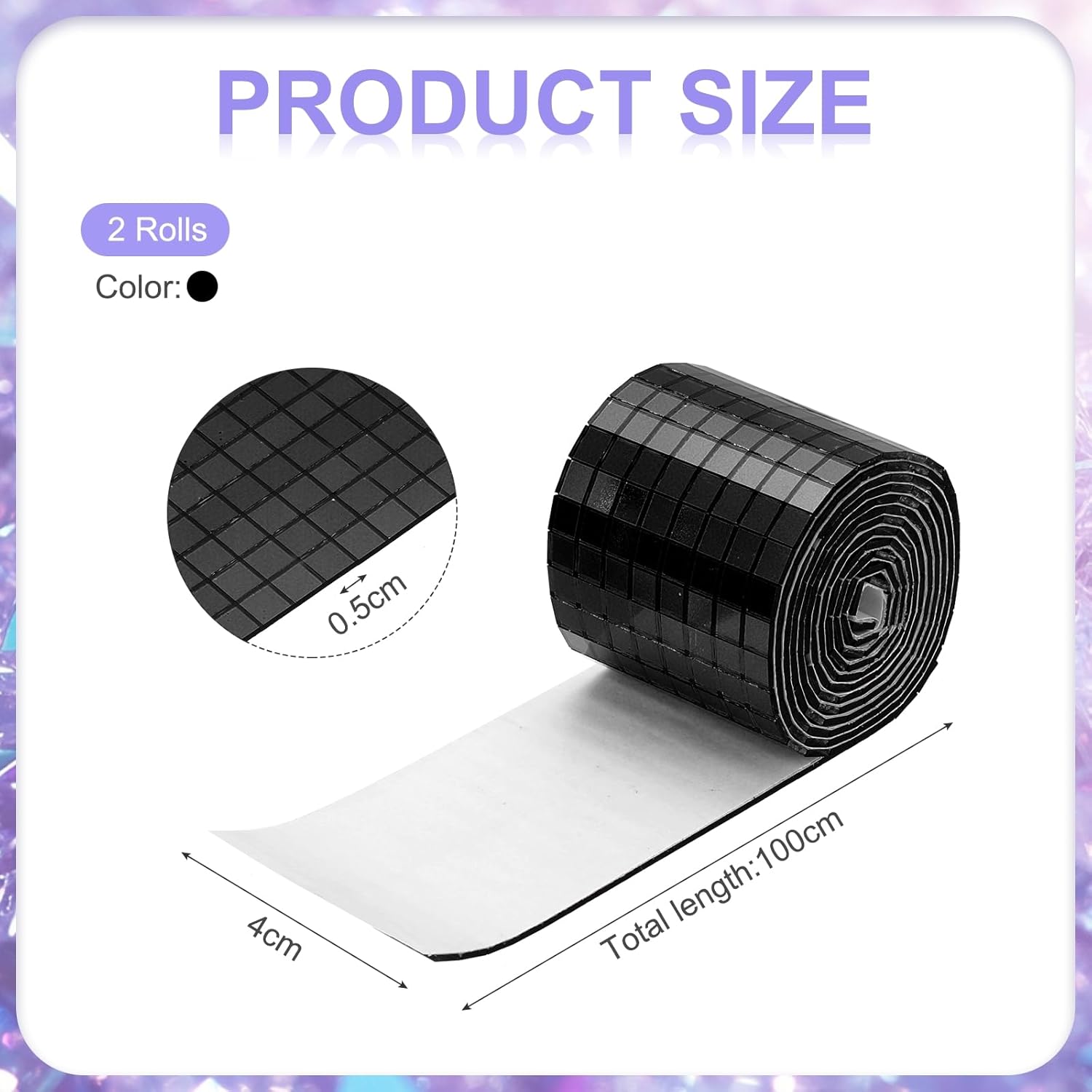 - we provide here, are in the size of: Size: Each roll measures 4 x 100cm (total 2 meters) ; Material: glass with strong adhesive backing ; Color: 2 roll of Black (total 2 rolls) ; In the package of: 3200 Pieces Adhesive Mosaic Tiles 5 x 5 mm Disco Tiles 2 Rolls (Black)