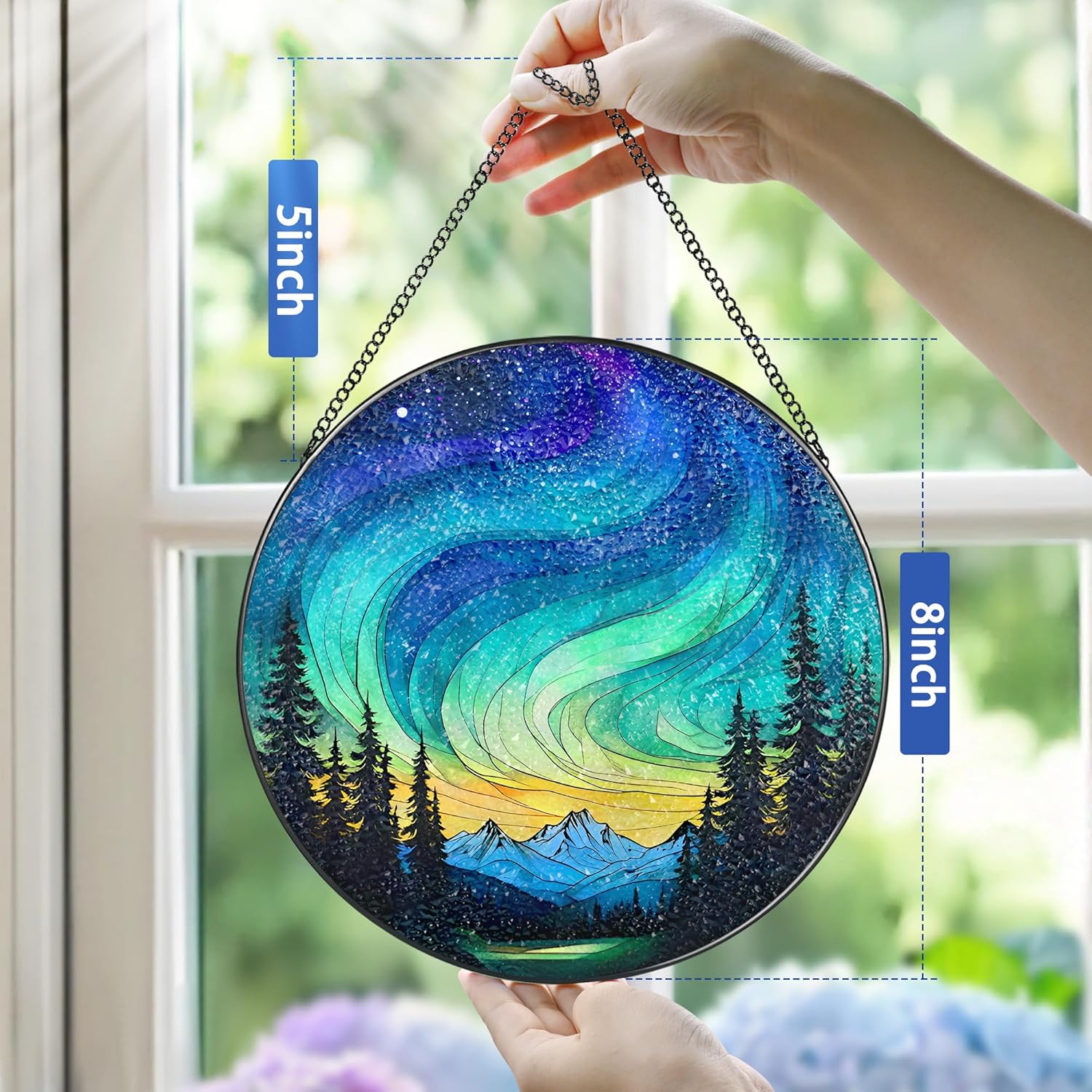 Stained Glass Window Hanging - 8 Inch Northern Lights Suncatcher for Window Doors Home Decoration, Valentine's Day Mother's Day Christmas Birthday Gifts for Women, Men, and Mom Grandma