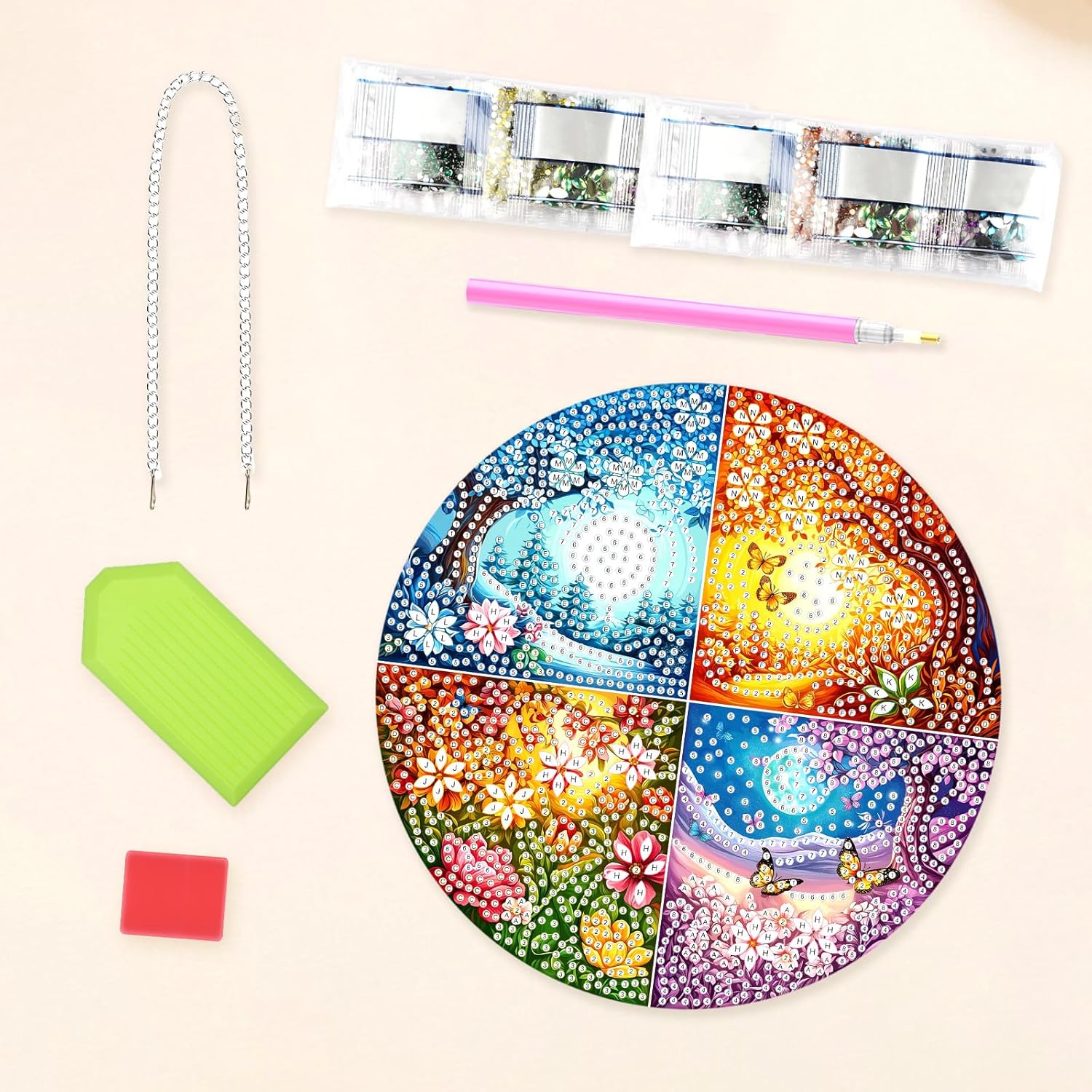 - Complete DIY Diamond Painting Kit for Adults: Includes everything you need: acrylic pendant, metal hanging chain, applicator pen, wax pad, diamond tray, and a full set of diamond painting drills. Enjoy a relaxing and creative craft activity