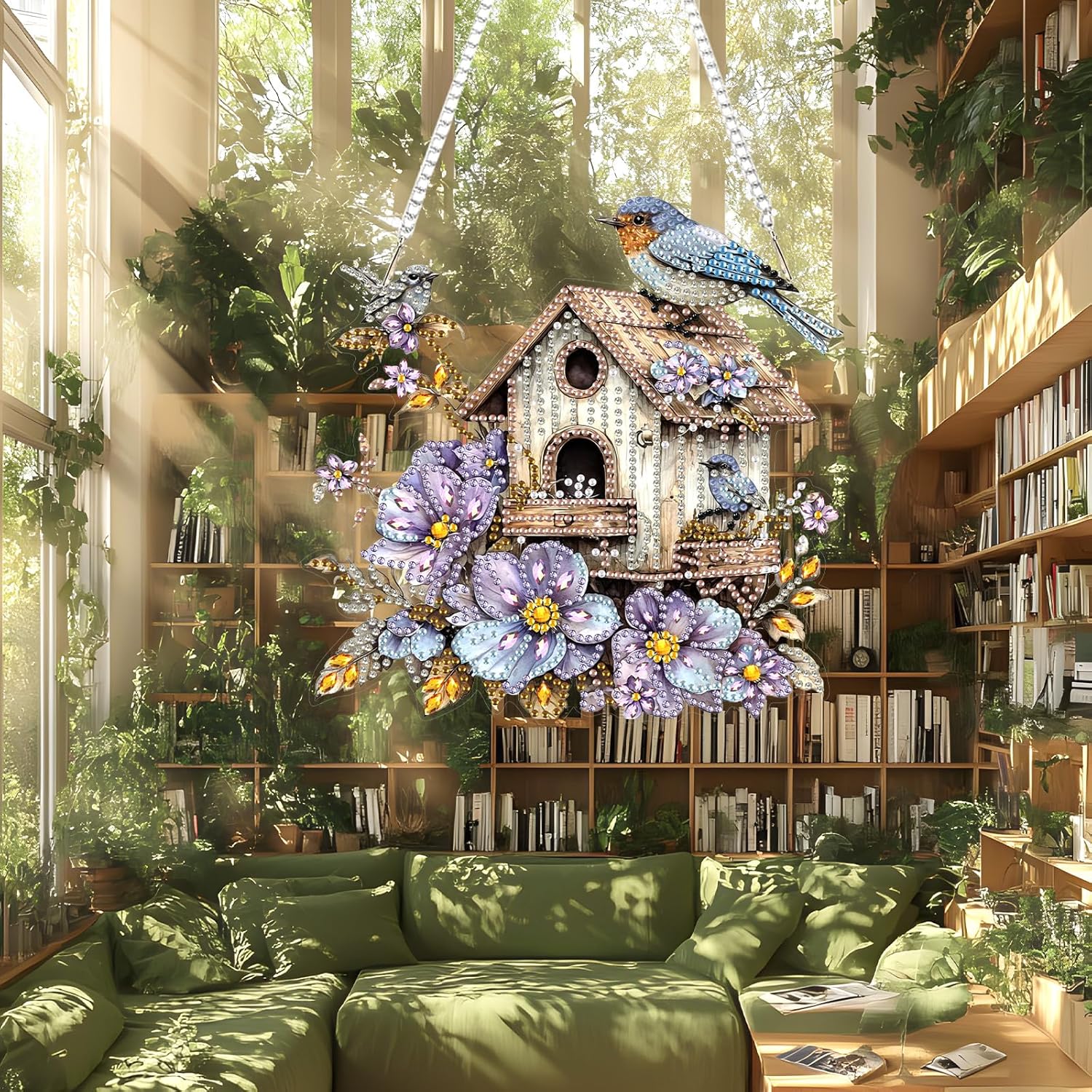 Lxmsja DIY Birdhouse Diamond Painting Hanging Ornament, Double-Sided Acrylic Flowers Bird Diamond Art Kit, Special Shaped Drill Pendant Window Art Kit, Suncatcher Hanging Craft Decoration 8x8 inch