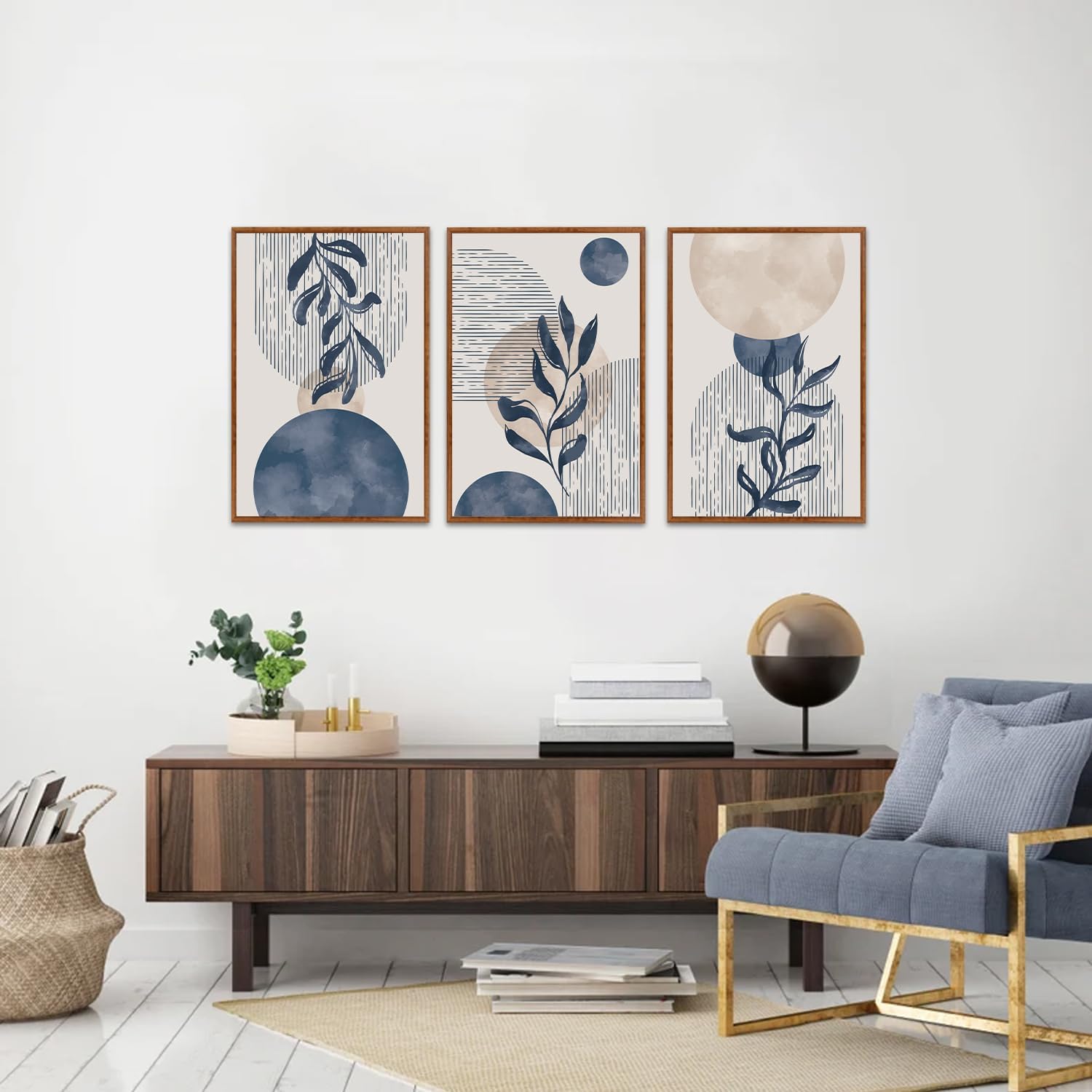KAIRNE Boho Plant Wall Art Set of 3,Blue Bohemain Framed Canvas,Abstract Geometric Line Wall Painting,Modern Nature Prints,Botanical and Moon Wall Art for Living Room Bedroom Office - 3Pieces,16”X24”