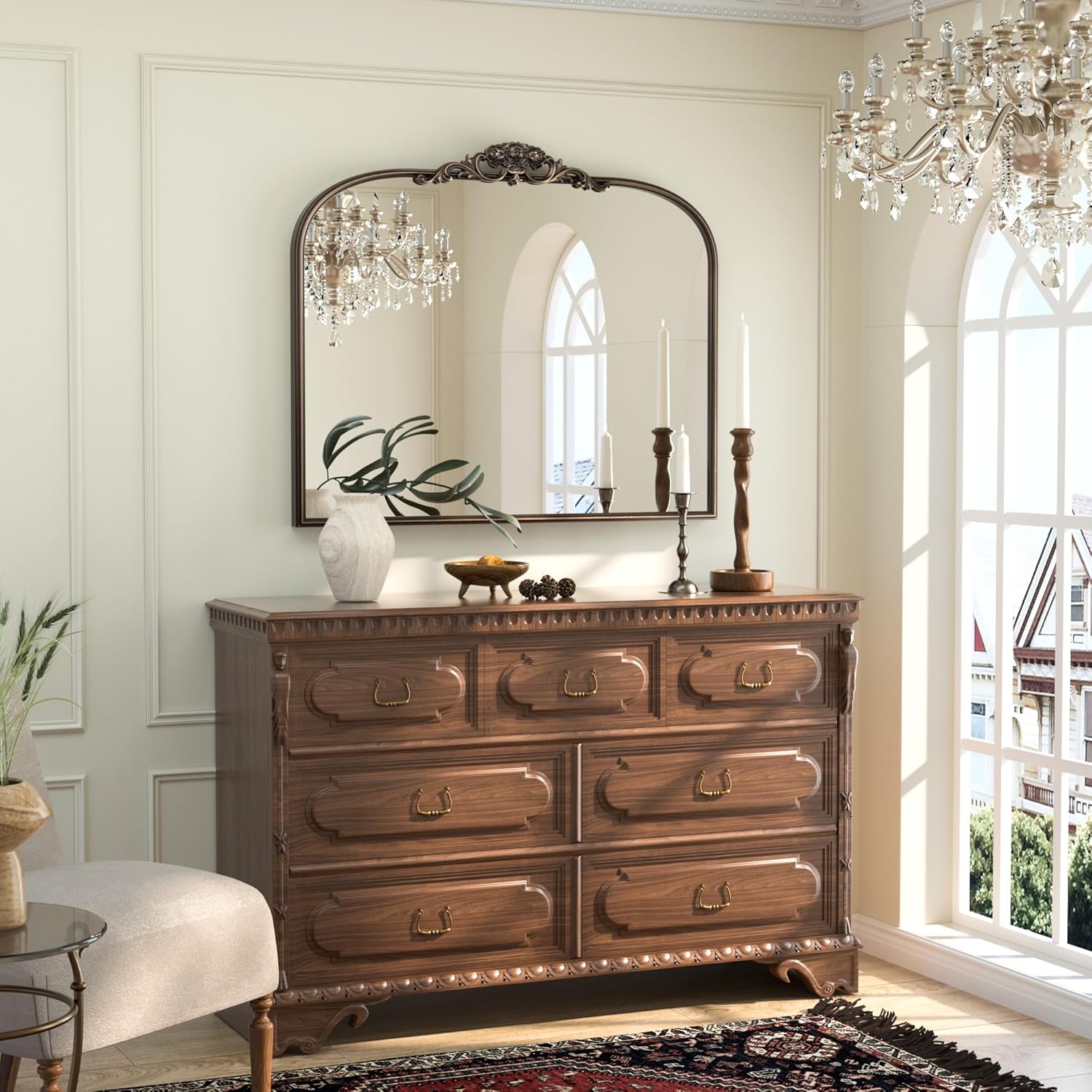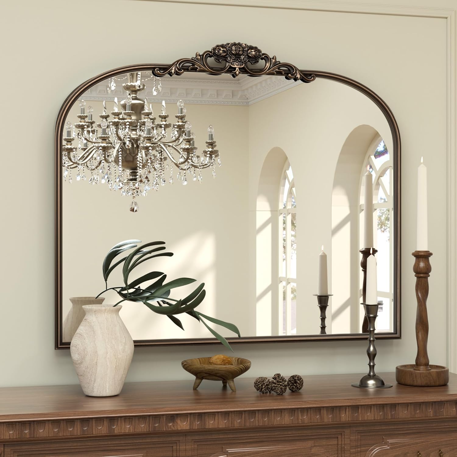 - 【Elevate Your Space with Baroque Grandeur】The Keonjinn Vintage Mirror is a masterpiece of timeless elegance, channeling the lavish artistry of the Baroque era. Its sweeping arched silhouette, adorned with an intricately carved wooden floral crown, transforms walls into canvases of historical opulence. Perfect as a statement centerpiece, this mirror infuses rooms with regal charm and a touch of old-world drama.