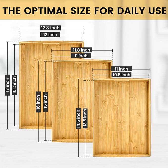 - 3 SIZES: Each set of wooden trays comes in 3 sizes. The large one (17" × 13" × 1.5") is perfect for displaying items or serving appetizers; the medium one (16" × 12" × 1.5") fits small spaces or coffee tables; and the small one (14.5" × 11" × 1.5") is stackable to save space.