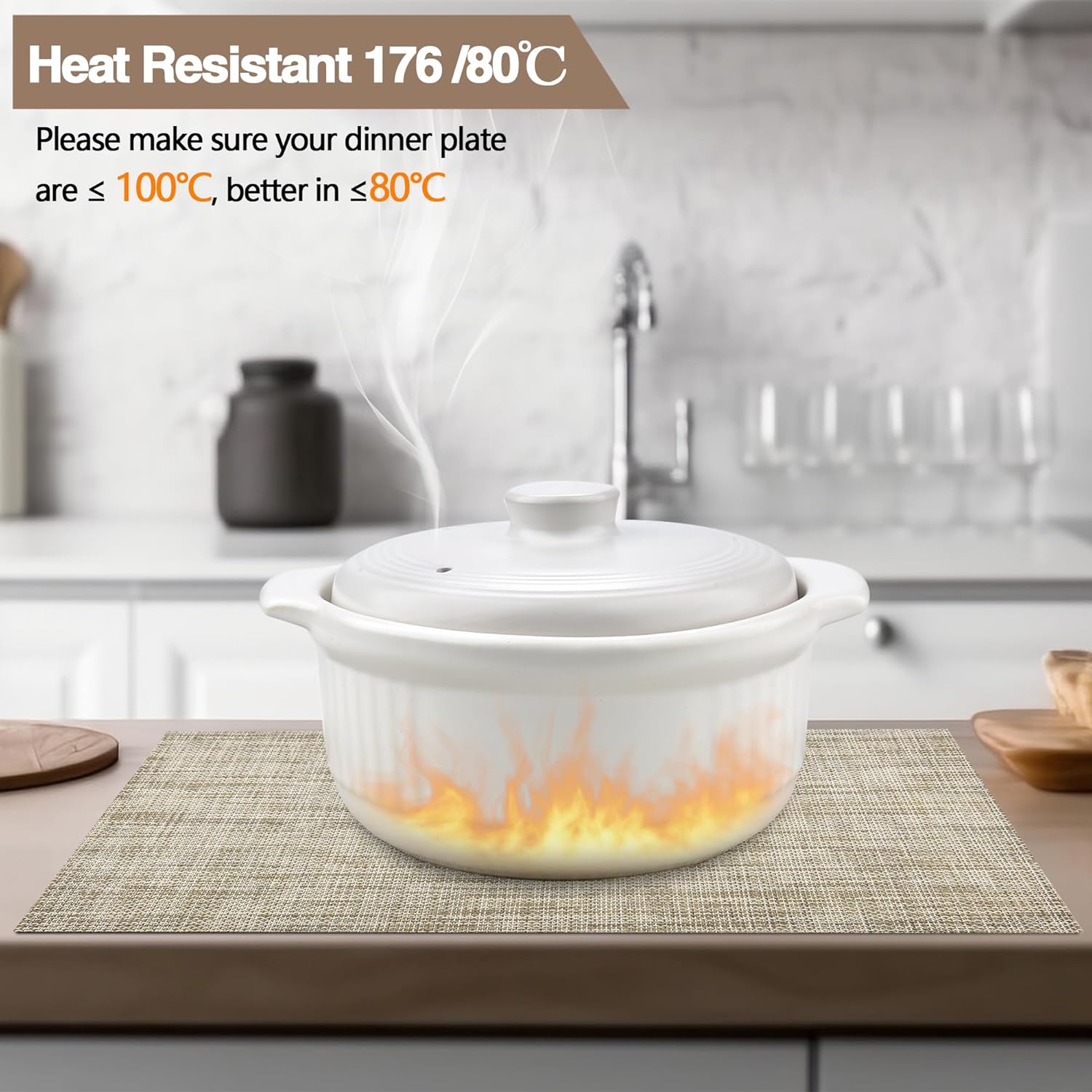 - Heat Resistant: Please make sure your dinner plate are ≤ 100℃, better in ≤80℃. It can prevent the table from slipping and scalding the countertop. These beautiful stylish vinyl place mats to add more fun to your dining table