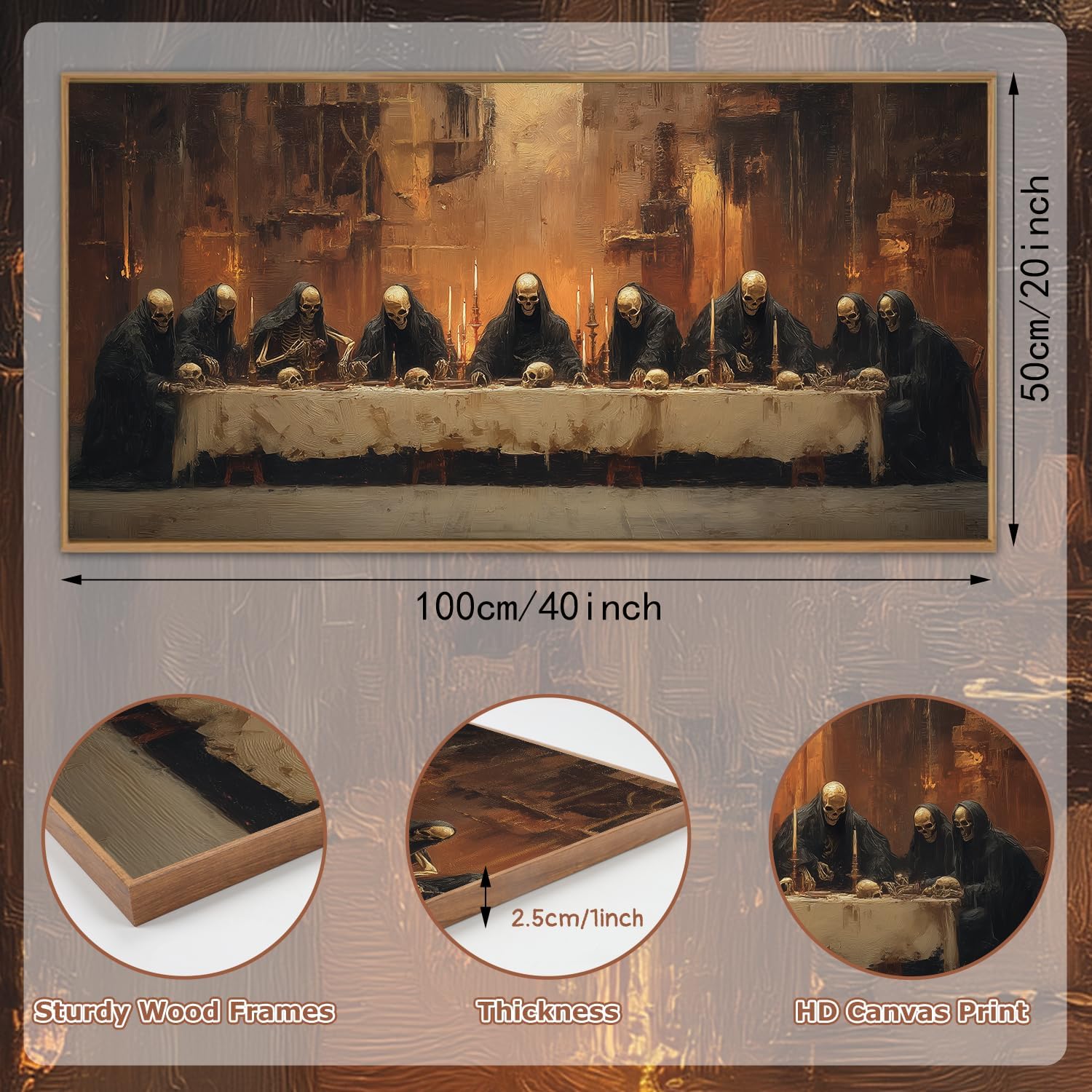 KAIRNE Framed Skeleton Canvas Wall Art,Abstract Retro Skull Print Set of 1(40”X20”),Scary Halloween Pictures,Horror Wall Art,Skeleton Last Supper Posters for Living Room Bedroom Ding Room Office Decor