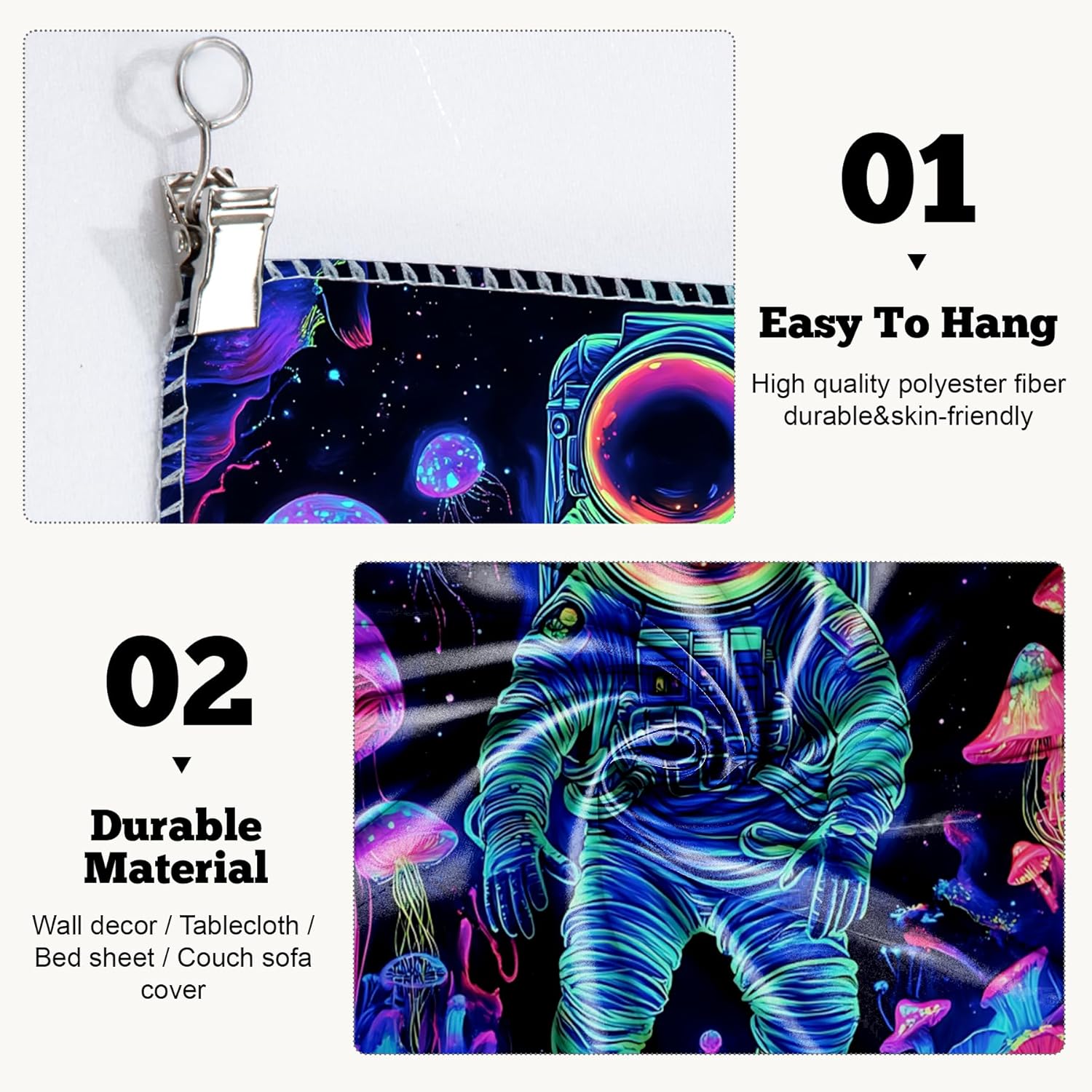 - Versatile Tapestry - With its durable materials and unique design, this blacklight tapestry can serve as a wall hanging tapestry, indie room tapestry, curtain tapestry, dorm room tapestry, ceiling tapestry, bedroom tapestry, glow-in-the-dark artwork or even a picnic blanket.