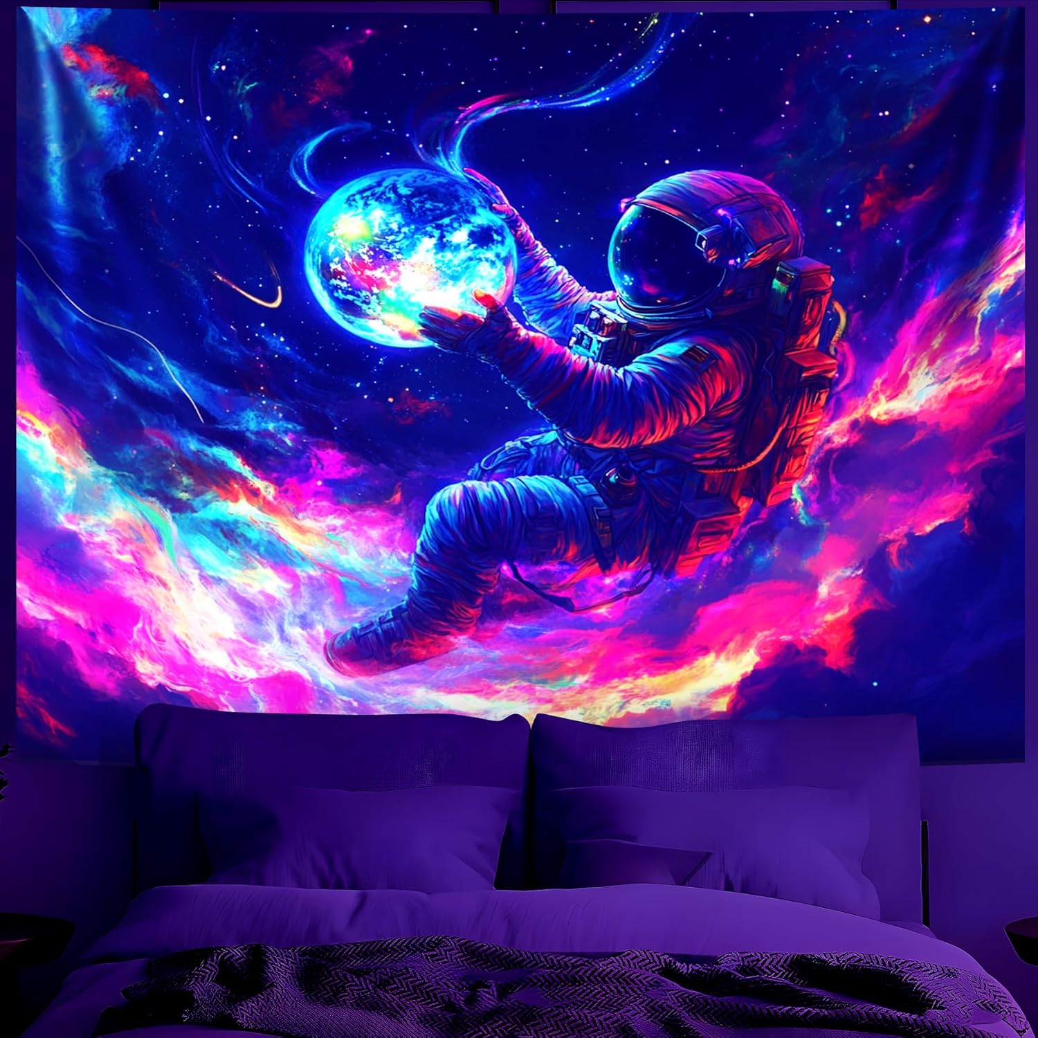 BVBOX Astronaut Space Blacklight Tapestry 79"x59", UV Reactive Floating Astronaut Iridescent Cloud Universe Galaxy Planet Glow in Dark Tapestries, Black Light Neon Upright Poster Wall Hanging Backdrop Decor for Bedroom Living Room