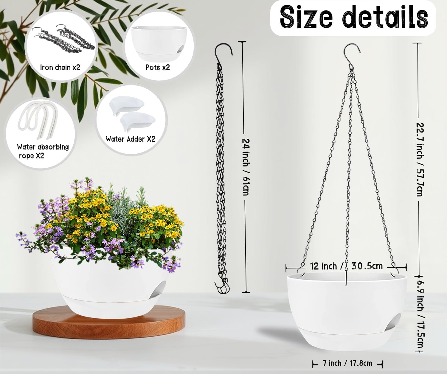 - ✅ 2 Large Self-Watering Planters: Double the value! Includes two 12-inch wide plastic hanging planters with built-in self-watering reservoirs to reduce the need for frequent watering and keep plants healthier.