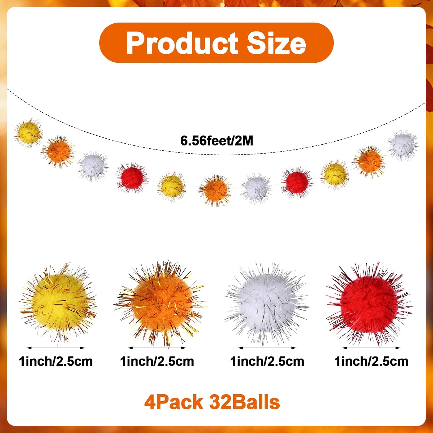 4 Pack Fall Glitter Felt Ball Garlands, Glittery Pom Pom Garland Orange, Yellow, White, Red Large Felt Ball Decorations for Autumn Thanksgiving Halloween Party Decor