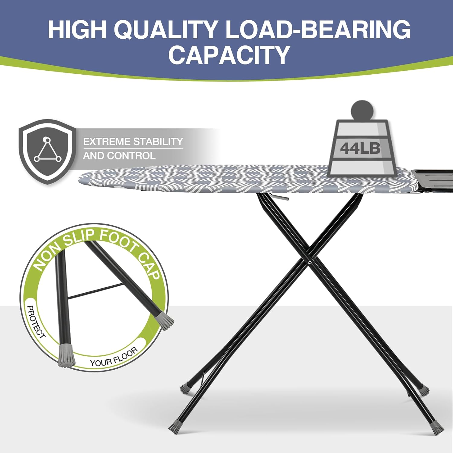 - Robust Steel Construction -Built with a heavy-duty steel frame and reinforced metal legs, this ironing board offers rock-solid stability. The non-slip rubber feet protect your floors and prevent sliding for safe and scratch-free use.