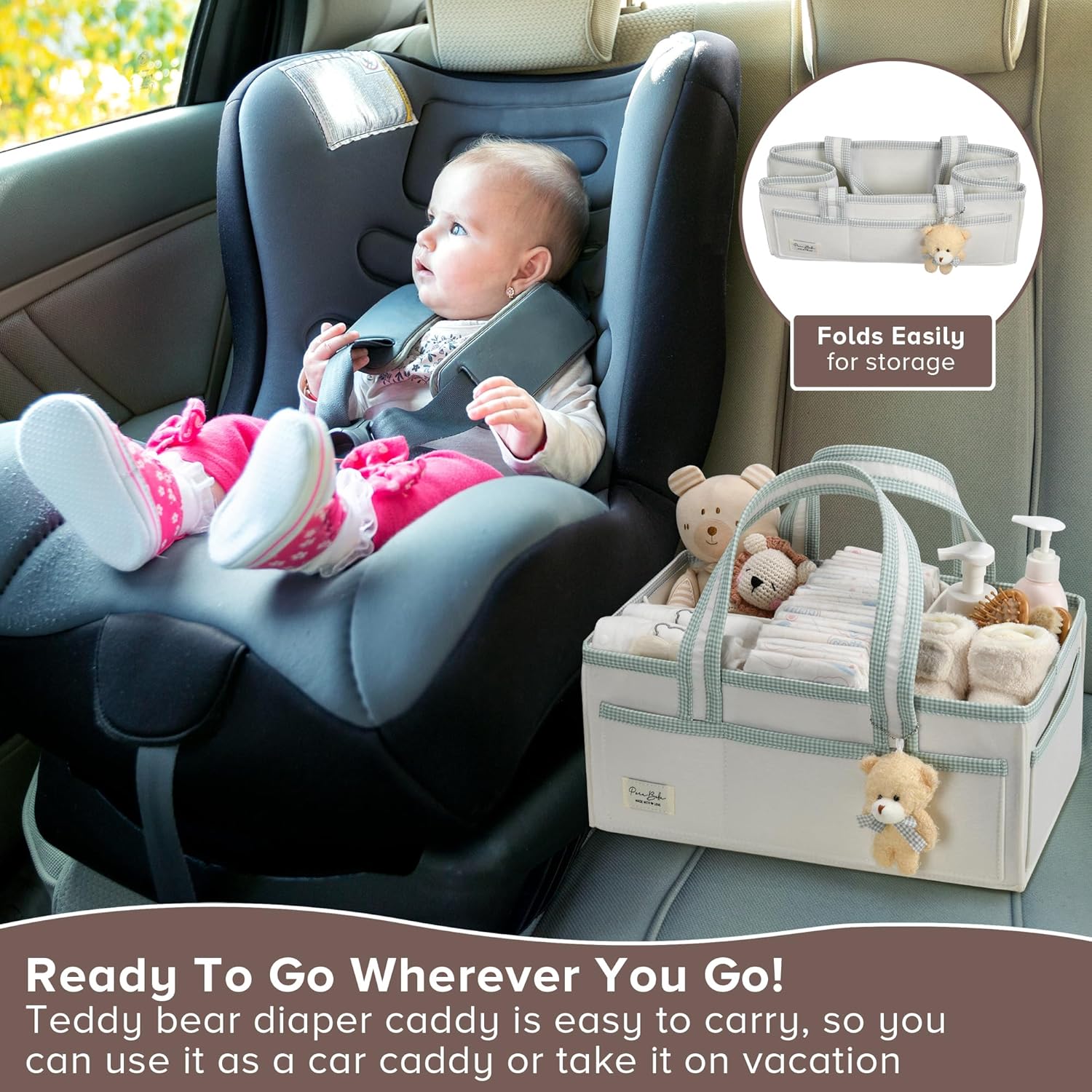 - STYLISH DESIGN AND BONUS TEDDY BEAR CHARM: Crafted with a premium felt exterior, your nursery decor with our neutral diaper organizer. It feels cozy & functional and it looks great on changing table and dresser. The caddy has 8 sturdy outer pockets for ample baby storage and a bonus teddy bear charm, adding a touch of delight
