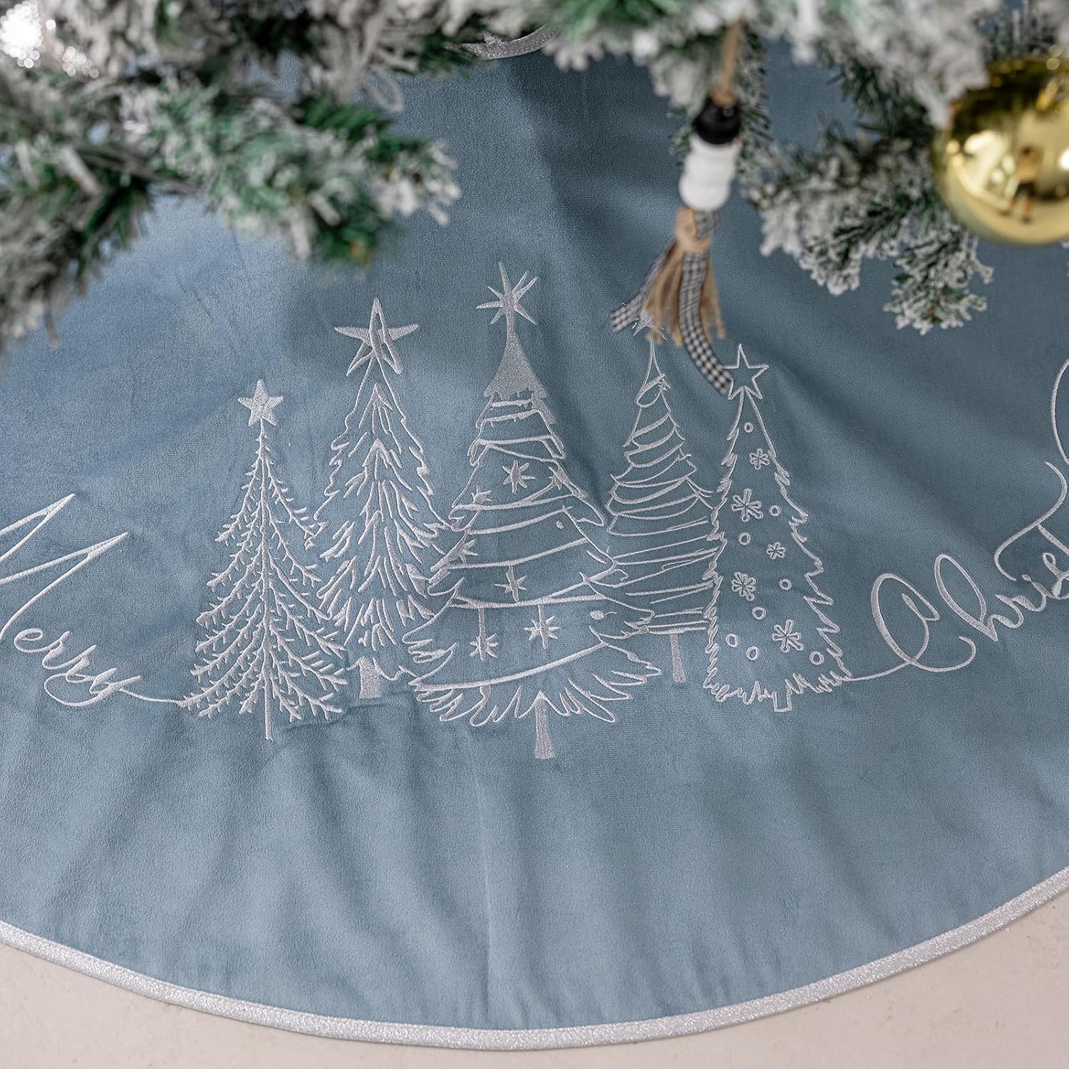 CROWNED BEAUTY Christmas Tree Skirt Blue Velvet Collar 50 Inch Embroidered Silver Pine Trees Soft Plush Fur Holiday Decoration (Blue) TS42-50