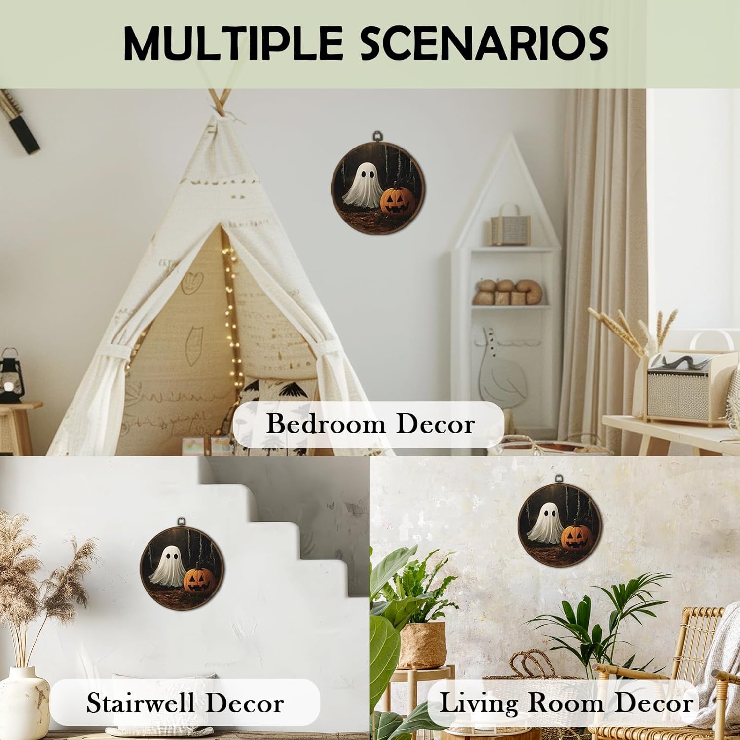 cvjutf Vintage Ghost Halloween Wall Art Framed, Ghost Bathroom Decor, Gothic Dark Academia Fall Round Wall Decor, Witchy Halloween Pumpkin Canvas Prints Art for Bedroom Bathroom Living Room, 10x10 In