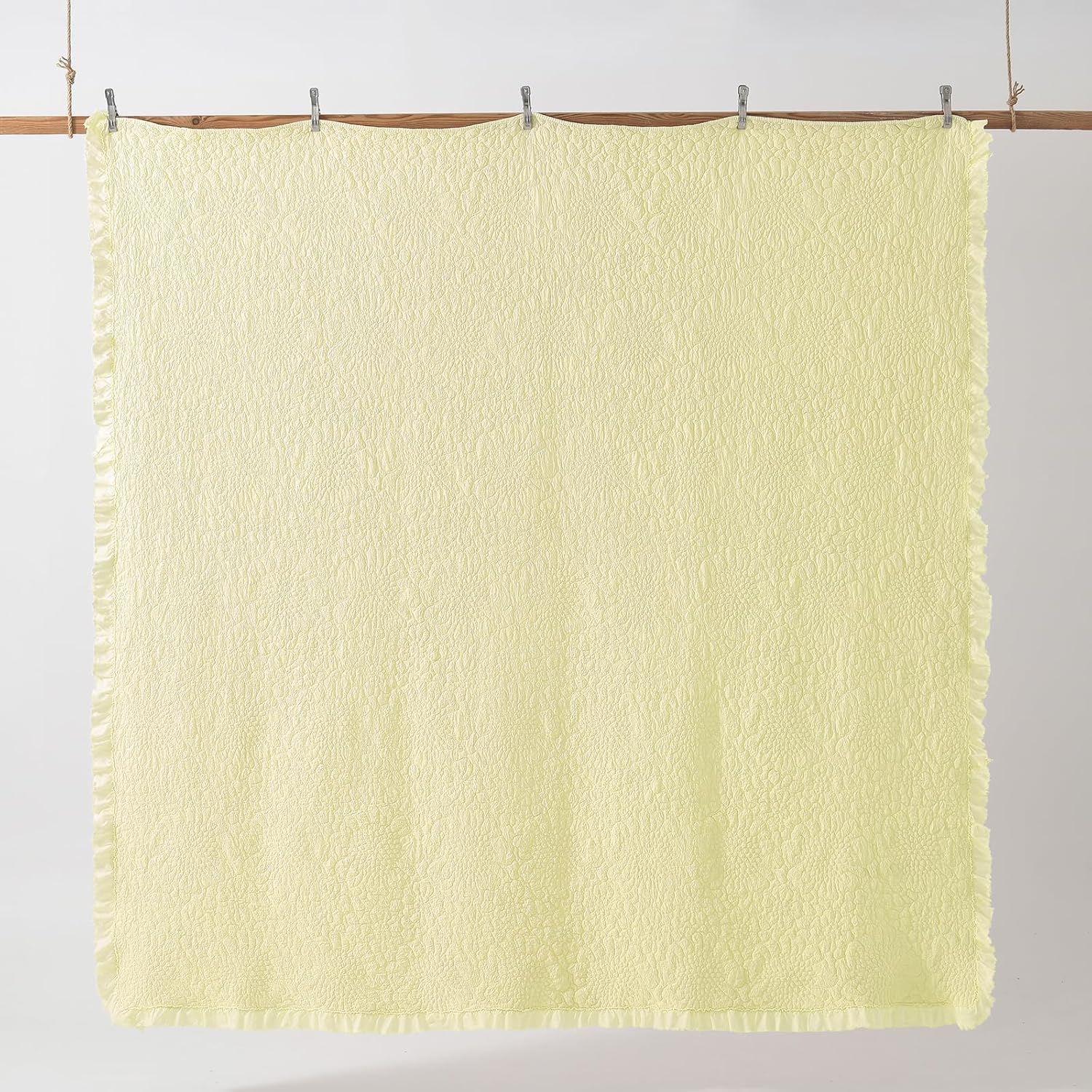 Light Yellow Ruffled Quilt Queen Size, Stone-Washed Microfiber Lightweight Crinkled Farmhouse Rustic Shabby Chic Bedding Set, 3 Pieces Reversible Bedspread Coverlet with Pillow Shams for All Season