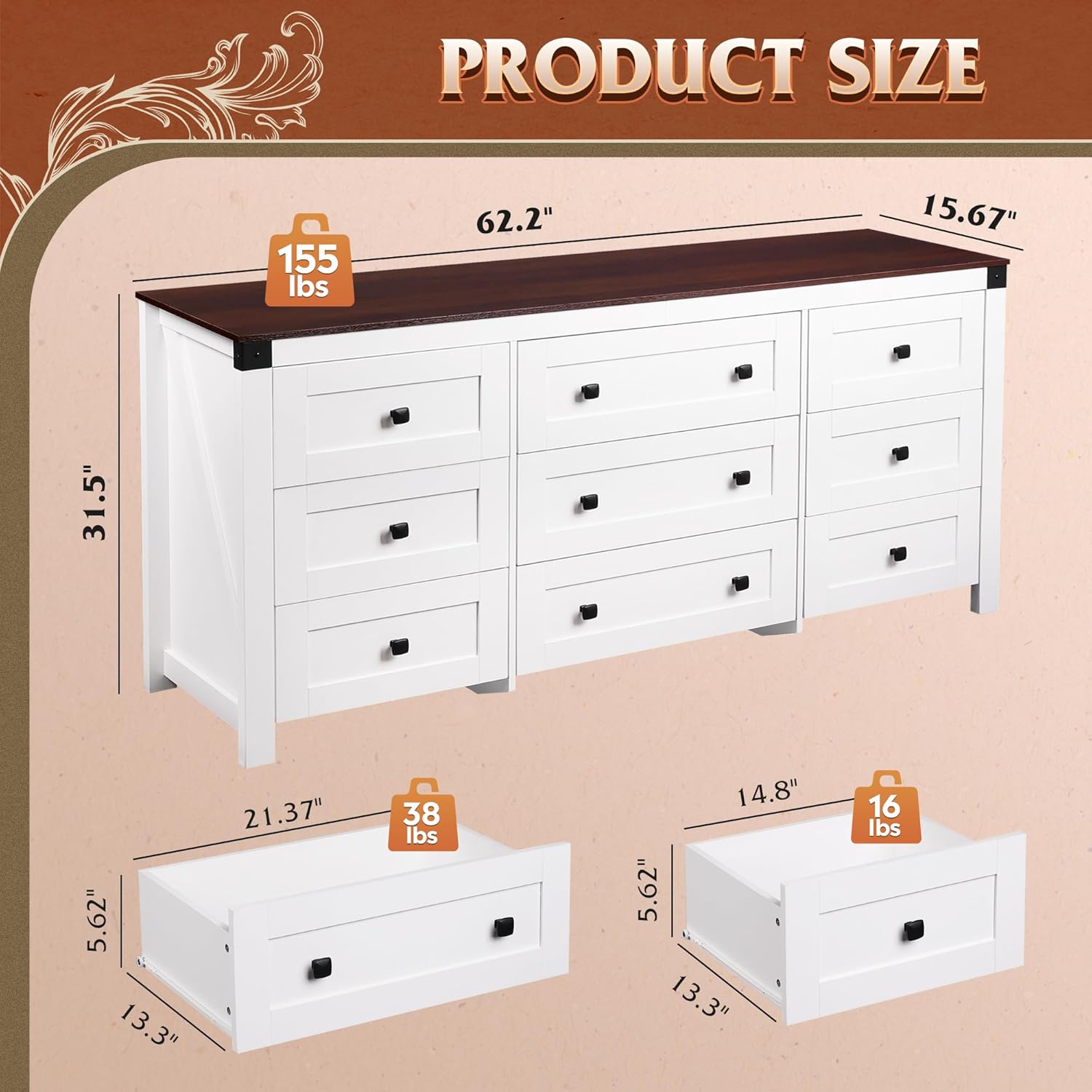 - 🎄【Farmhouse 9 Drawers Dresser】This wooden dresser features a white with a brown wood top, retro square handle adds a rustic charm, simple design exudes warmth and comfort, can be used for bedroom clothing organizer, entryway table, decorative storage for living room.