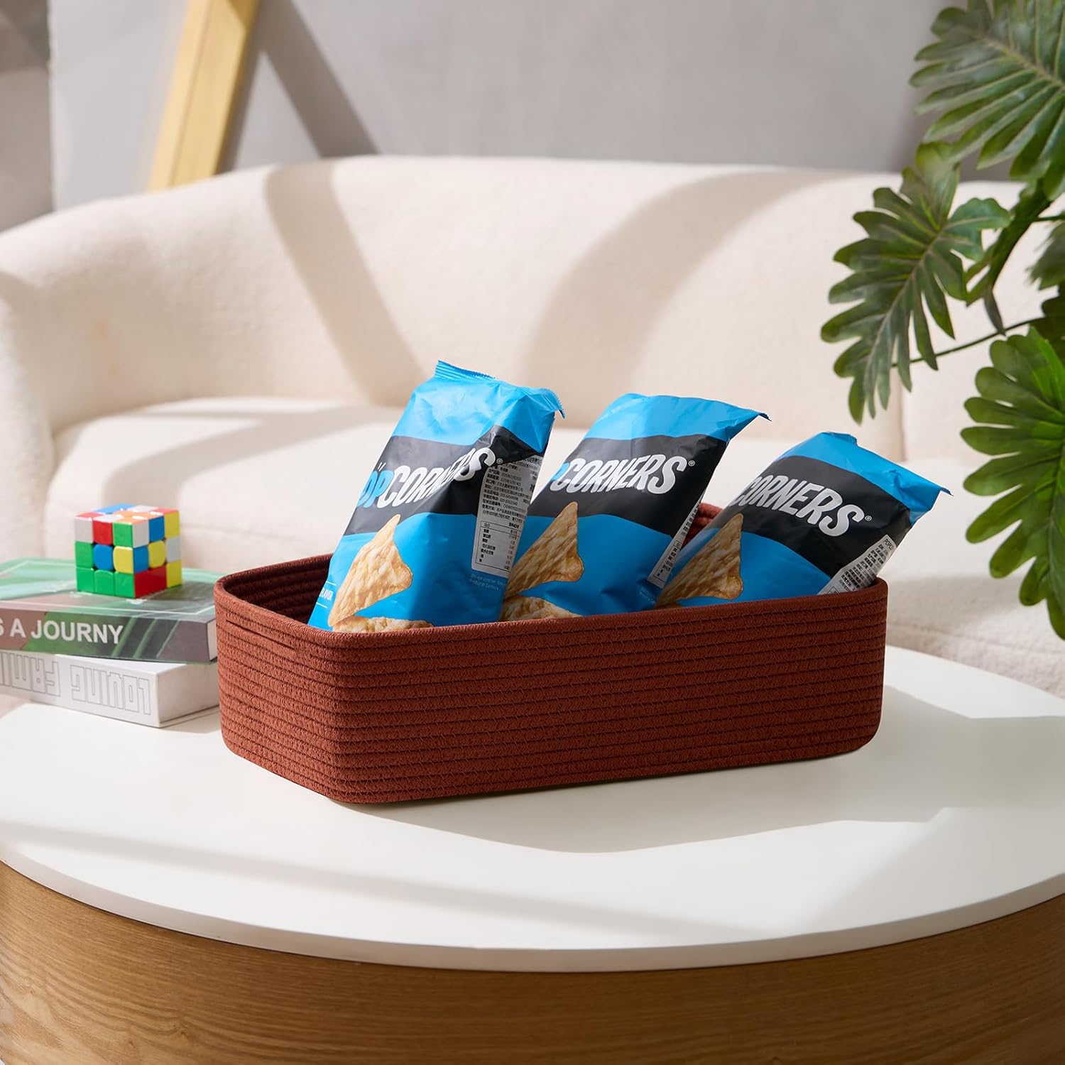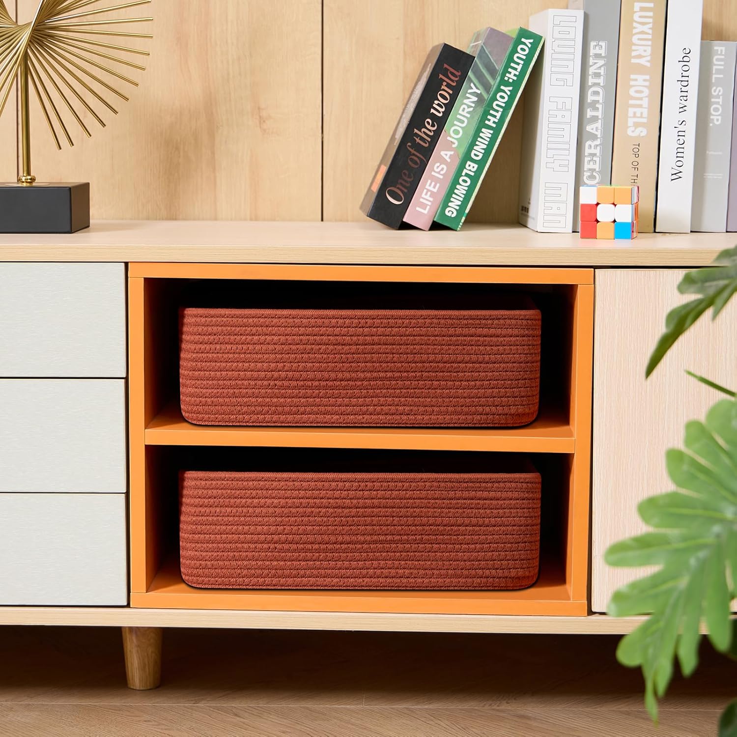Large Shallow Organizing Baskets 15x11x5.1 Inches - Rope Woven Storage Bins for Bathroom, Shelves, Cube Closet, Red 2 Packs