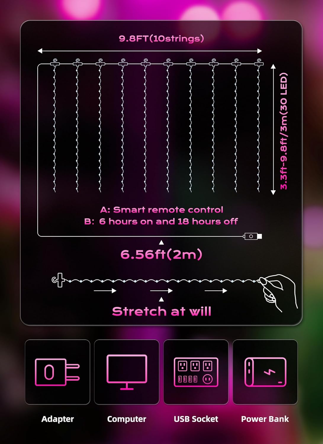 - [Safety & Decoration] Operated with 5V low voltage, our fairy curtain lights glow with low heating, and it is safe to touch; It can be safely hung on the curtains or on the wall. It is a wonderful decor for dorm, college, bedroom, party, birthday, wedding, Christmas, New Year, indoor, outdoor, classroom