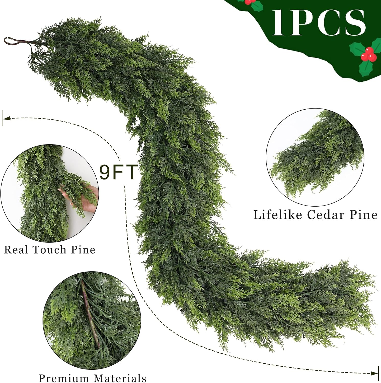 9FT Real Touch Cedar Garland - Artificial Christmas Garland Fake Green Faux Thick and Lush Pine Needles Garlands for Table Fireplace Mantle Holiday Home Indoor Outdoor Decor (1PCS)