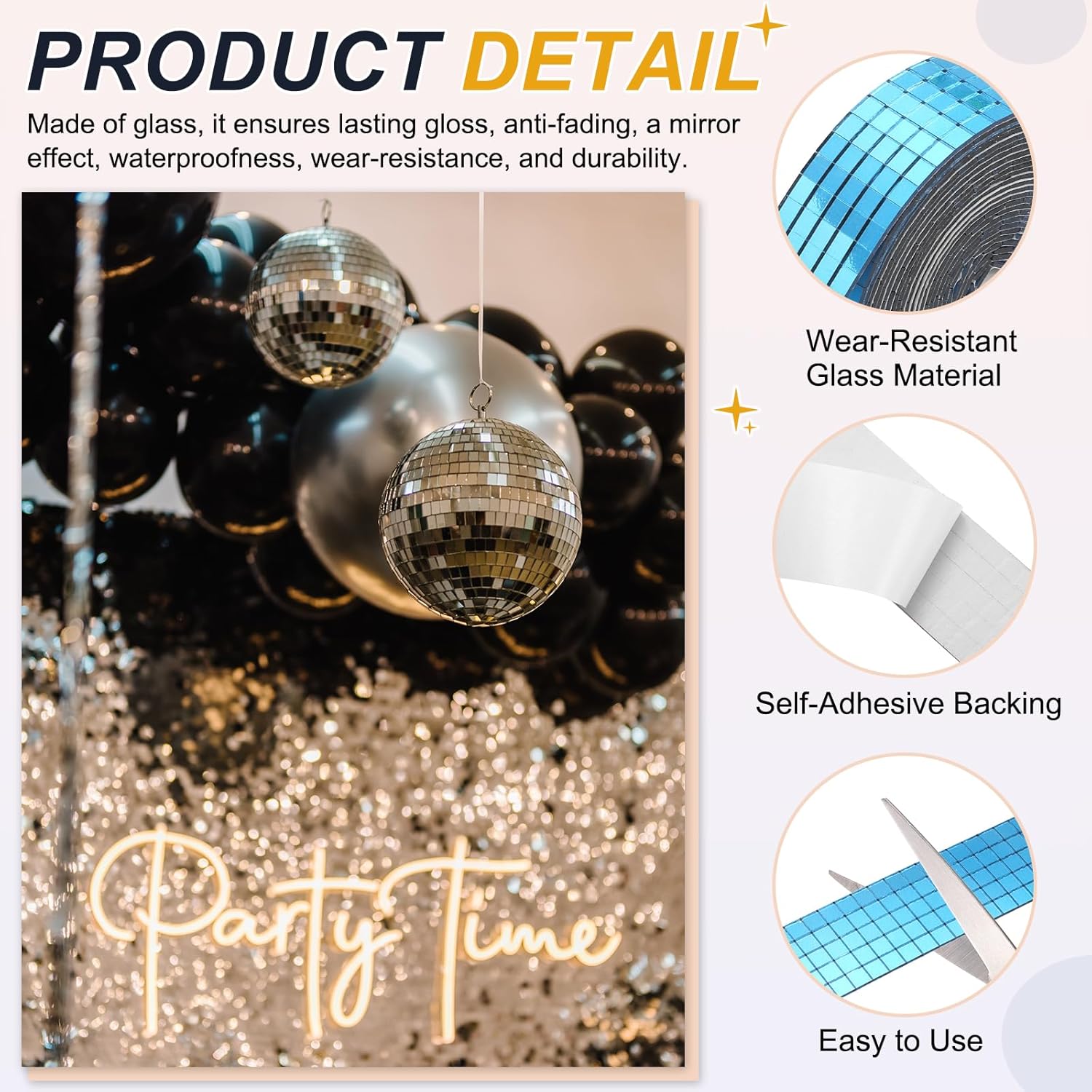 - Advantage: Wear-Resistant Glass Material: Made of glass, the glass material ensures lasting gloss and anti-fading and has a mirror effect, they are waterproof and wear-resistant, durable. Self-Adhesive Backing: Each tile comes with pre-applied adhesive, the tiles are not easy to fall off and easy to cut, and can be easily pasted on any clean, smooth surface without additional glue.