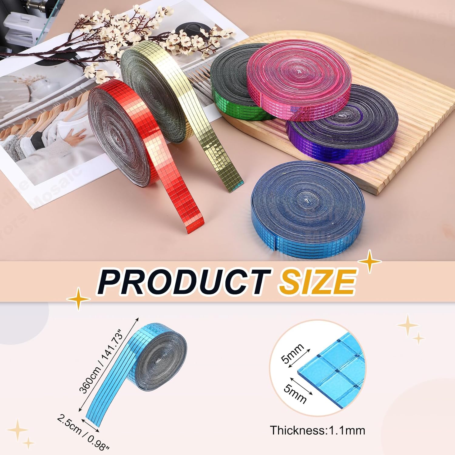 - Specification: Color: Light Blue; Material: Glass; Size:360x2.5cm/141.73x0.98Inch(LxW); Thickness:1.1mm/0.04inch; Each Tile Size: 5x5mm/0.2x0.2inch; Packing List: 3600 Pcs x Self Adhesive Mirrors Mosaic Tiles (Roll of 1)