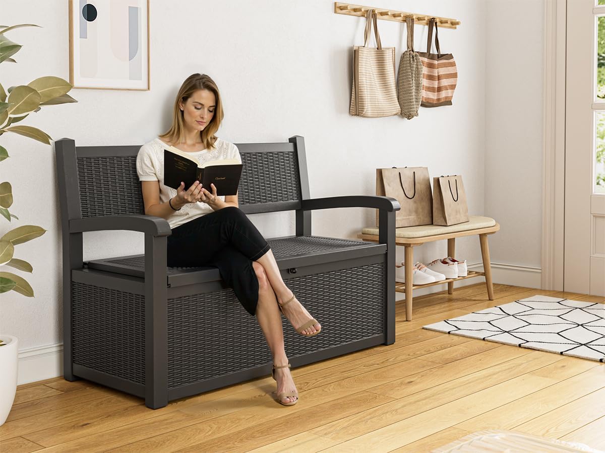 - Massive Hidden Storage: Unlock 70 gallons of extra space beneath this deck box bench, measuring 51.2 ''L x 22.4 ''W x 34.6 ''H; Organize patio cushions, gardening tools, pool toys, and seasonal items effortlessly. Open lid design keeps contents dust-free and discreetly hidden.